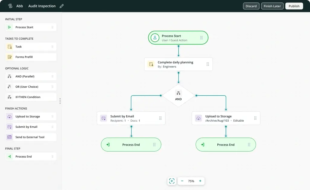 Get started easily with our template, checklist and workflow libraries, or create your own with our drag-and-drop form and workflow builder. No IT department required.