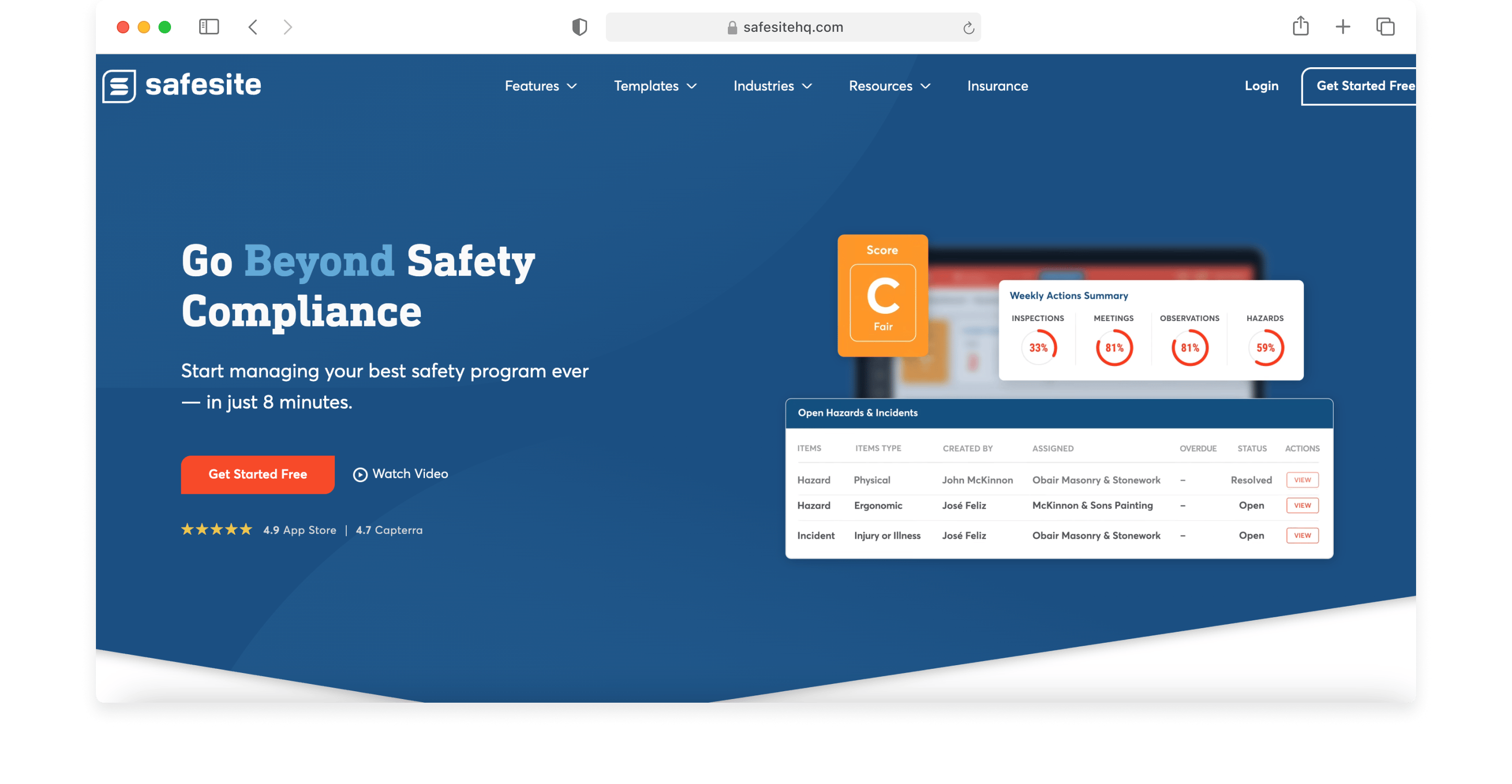 Standard safety operations like inspections, hazard reporting, incident management and compliance tracking are covered in Safesite’s features.