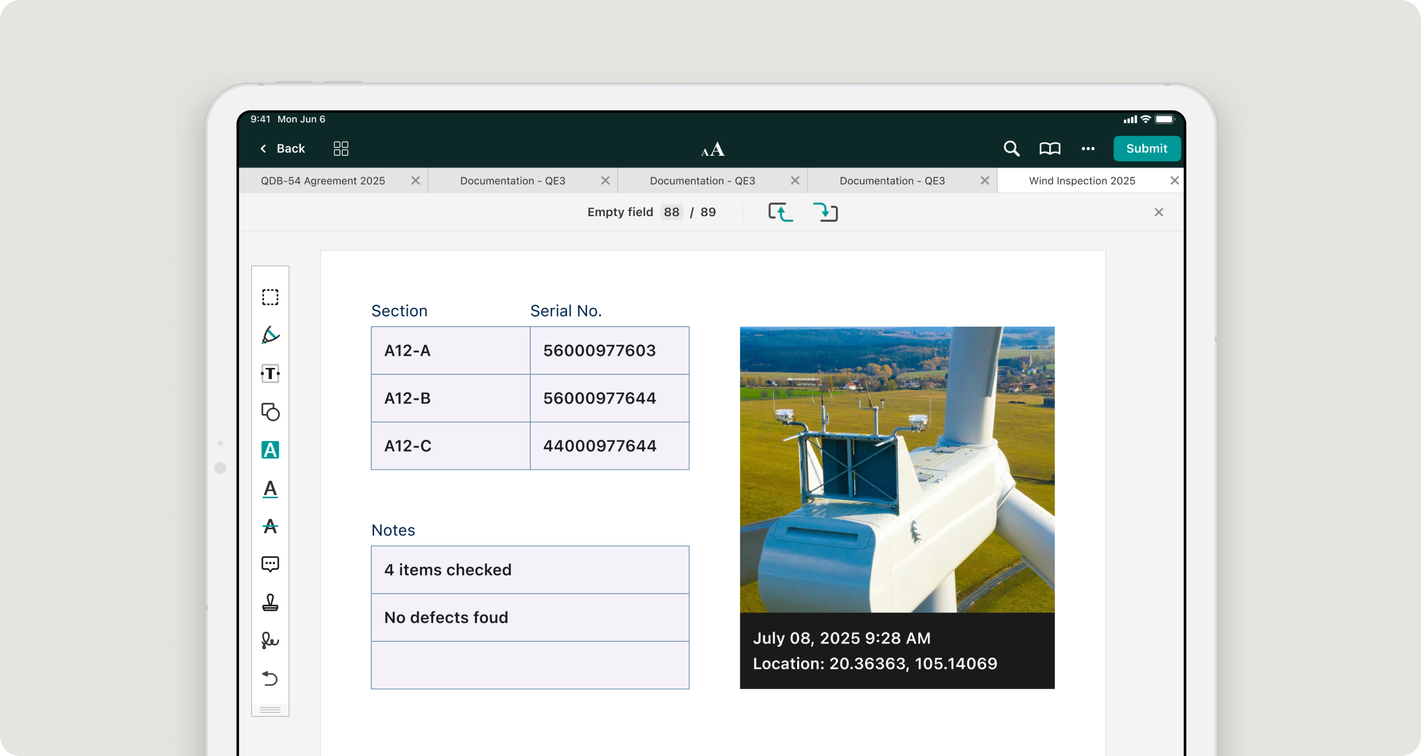 A wind turbine technician fills out around 3 to 10 maintenance checklists per shift, (depending on the site conditions). Some take a few minutes, while complex inspections like gearbox assessments can take over an hour to collect photo evidence, capture sensor data, and fill out compliance forms.