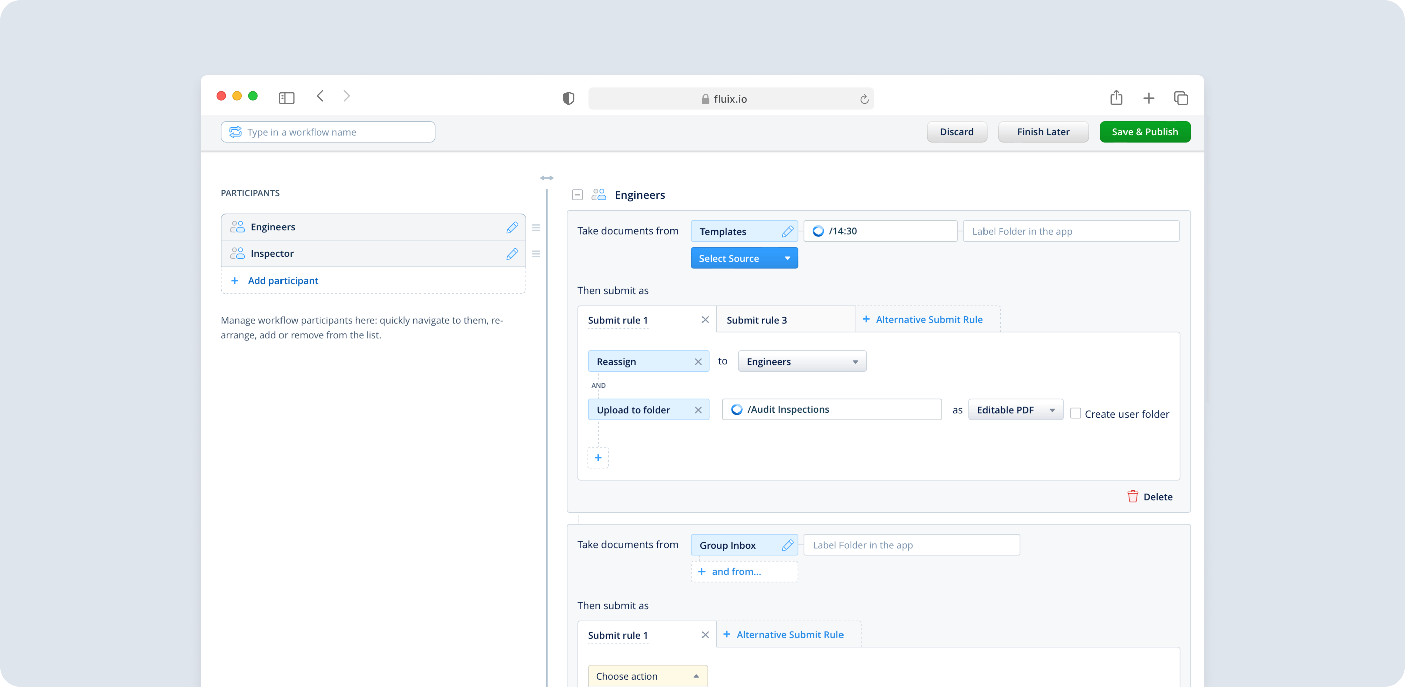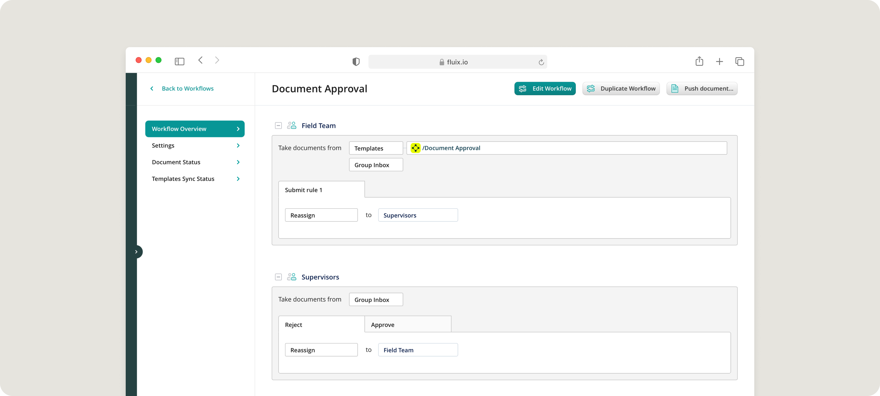 Fluix Docs is document-based workflows that move your forms where they need to go. You define the workflow steps up front: who reviews what, what happens if the form is approved or rejected, and where it gets sent and stored. Once it’s done, it’ll run automatically in the background.