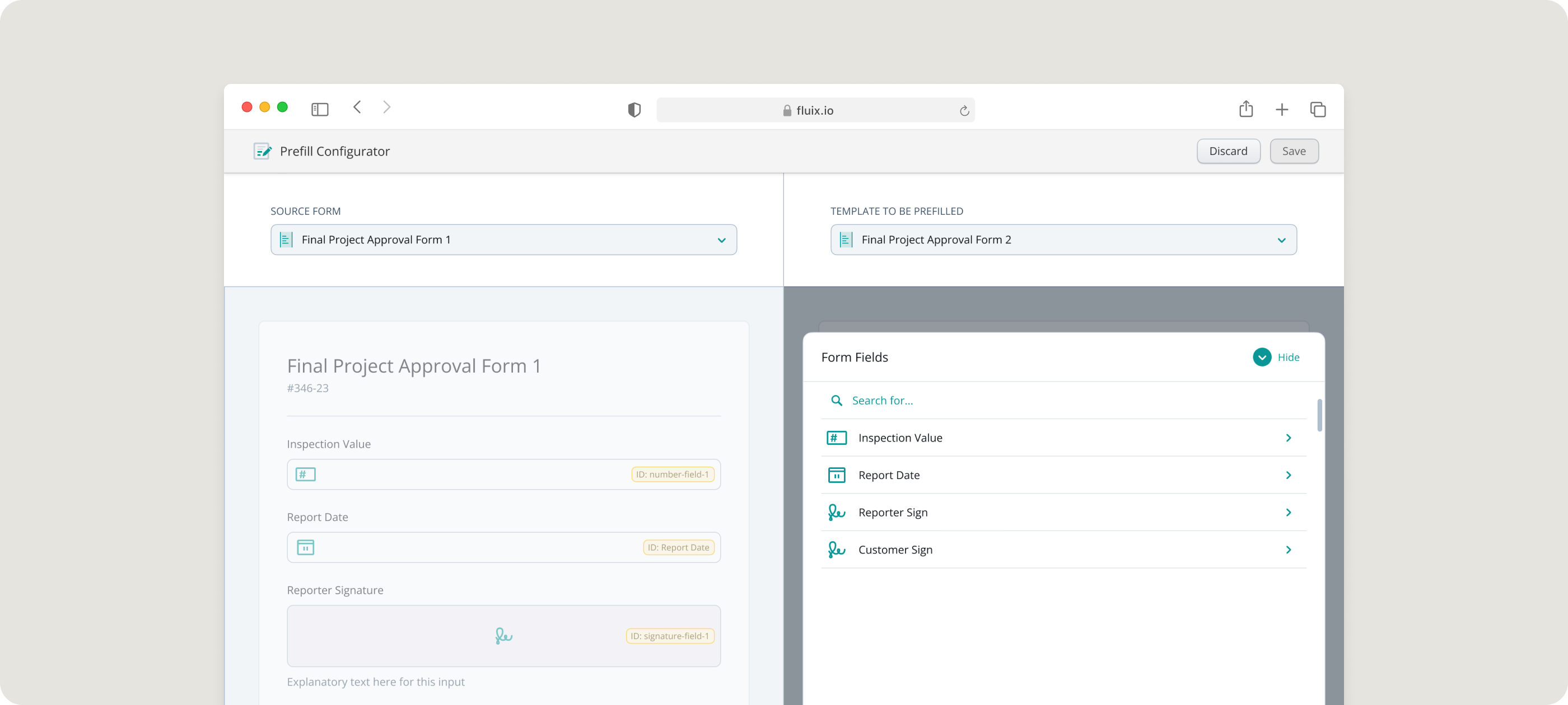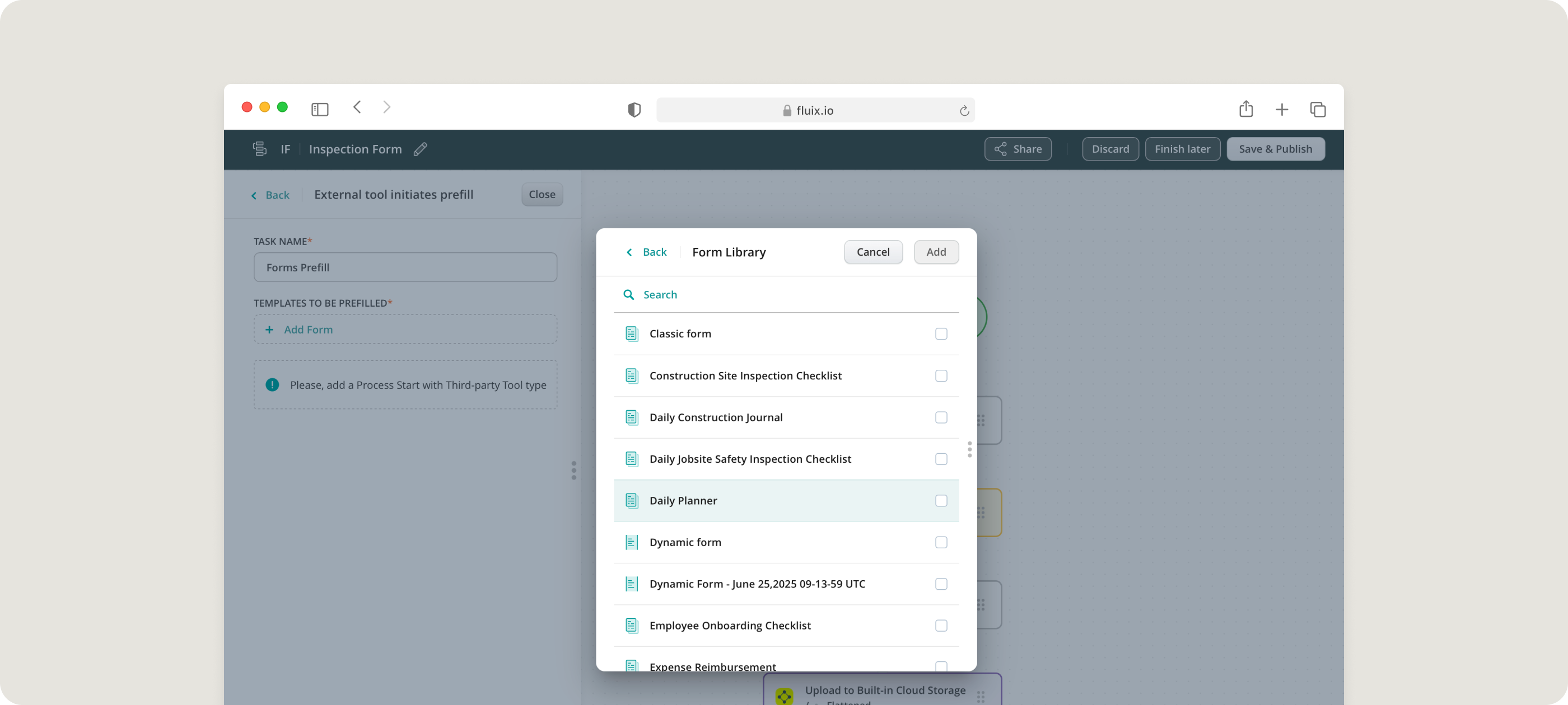 Basically it works as follows: during the workflow, Fluix sends a request to the external tool, retrieves the necessary data, and uses it to prefill the forms in the middle of the process.