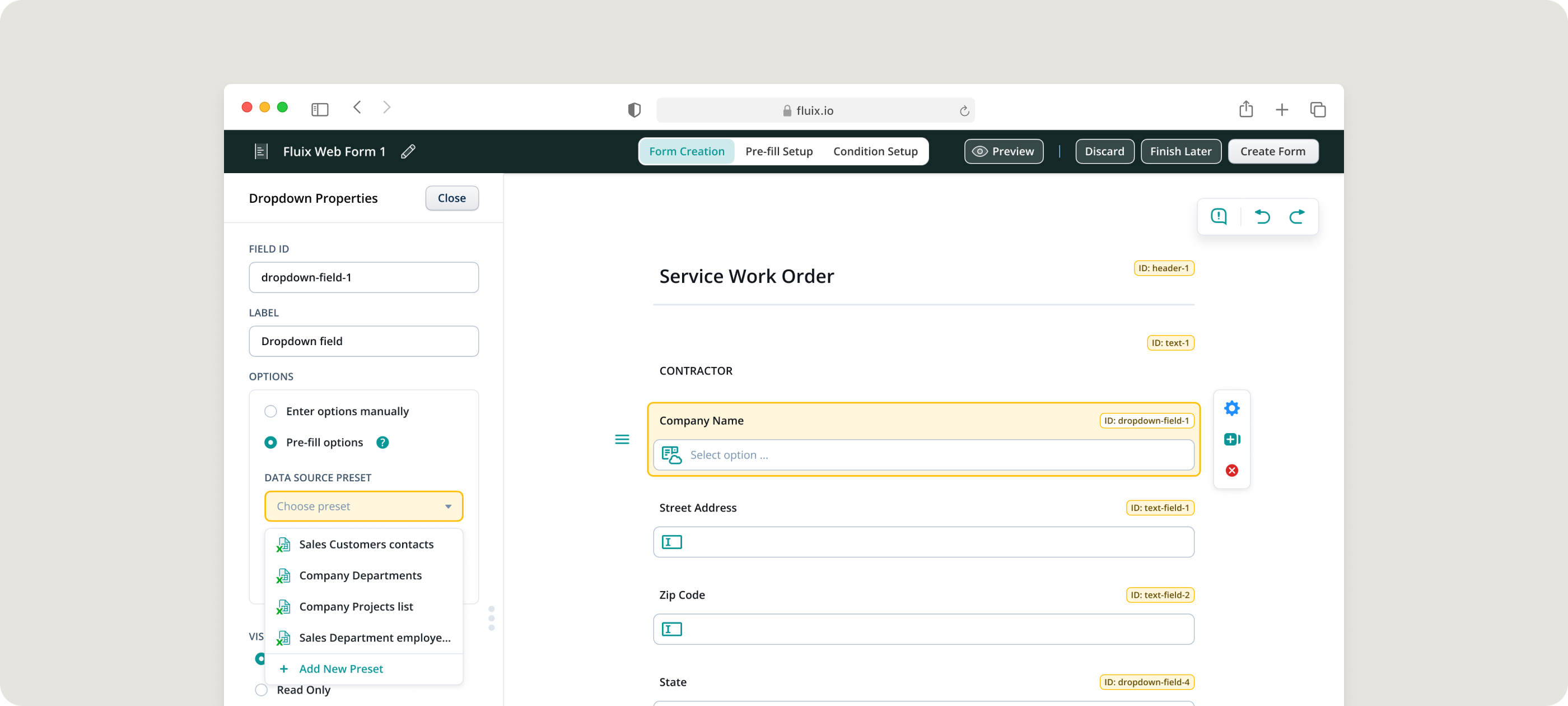 To set this up, start by preparing your data in a spreadsheet or exporting it from your internal database as a CSV file. From there, upload the file into Fluix and choose which column you want to appear in the dropdown field.