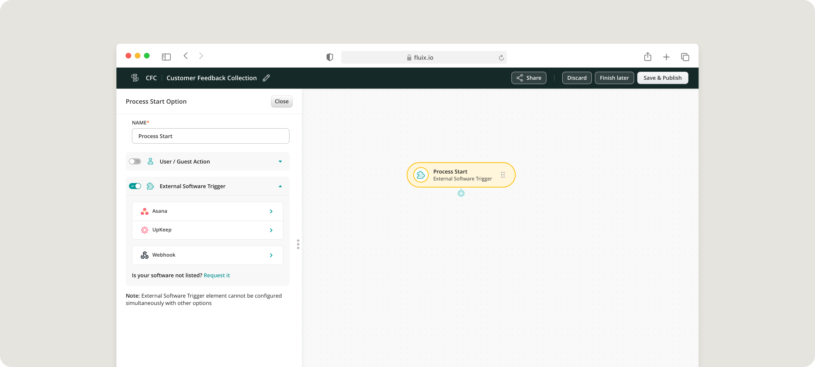 In this case, the other tool starts the process. When something changes in that system (like a status update or new record), it triggers Fluix to create a task with prefilled data.