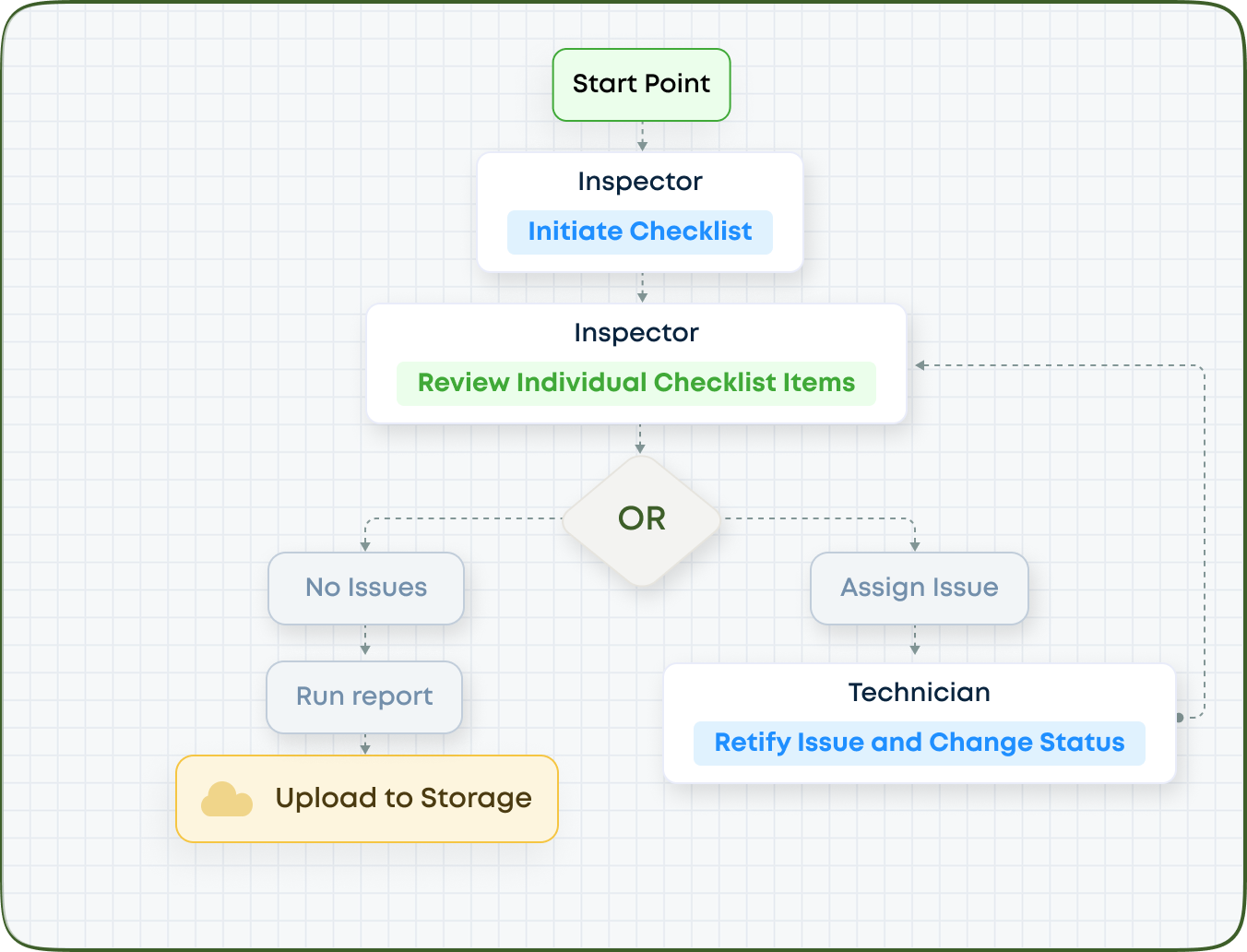 - The Inspector takes the equipment inspection checklist and fills it out, going through the items. If everything is in order with the equipment, the report is filed. If there is an issue with the equipment, the Inspector assigns the checklist to the Technician for inspection.