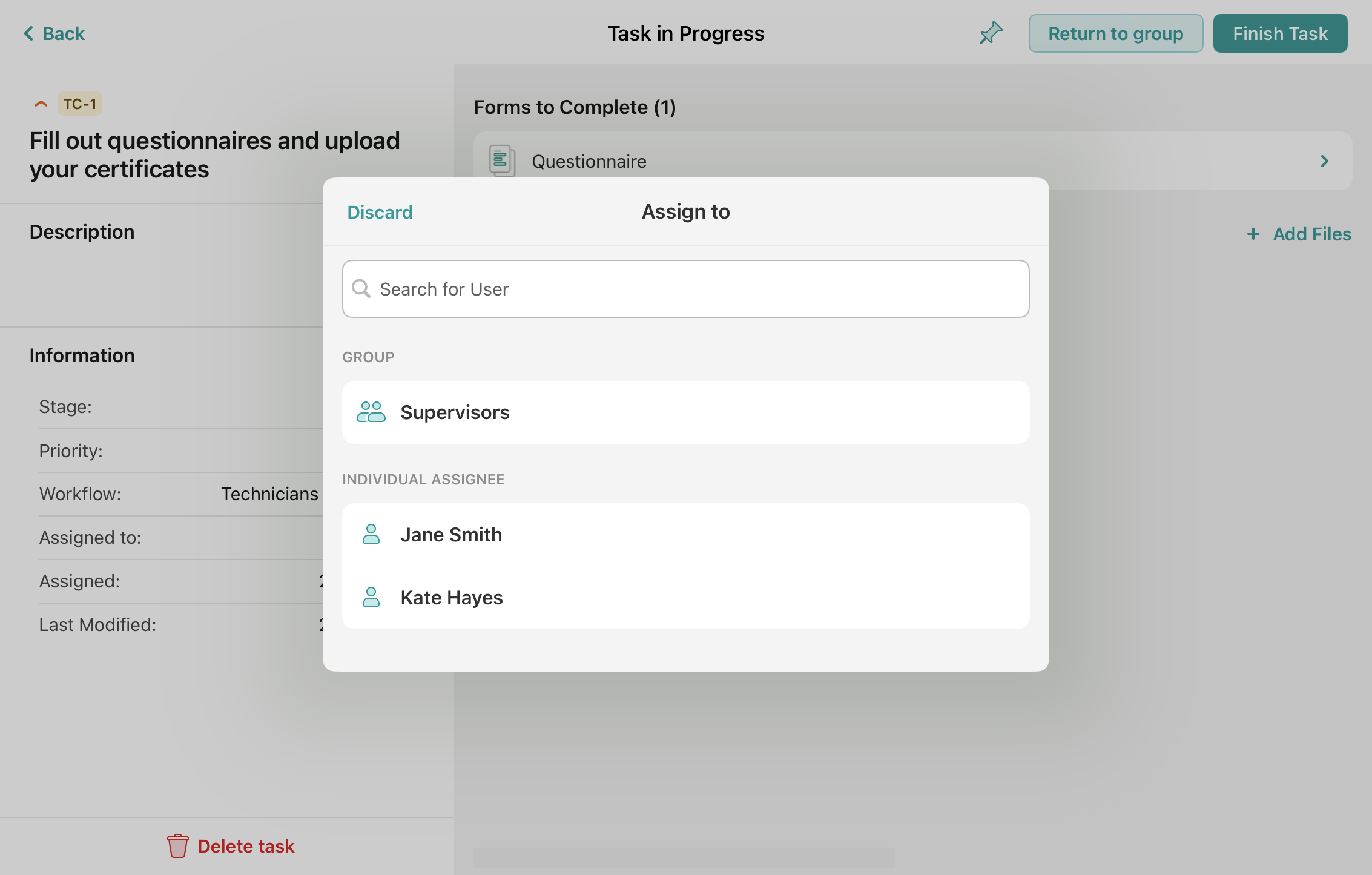 Once you tap the ‘Finish Task’ button, depending on the setup, you might receive a list of alternative submit actions to choose from. For example, if your Fluix account admin preconfigured it, you may select the individual assignee from the preconfigured group in the flow to whom you would like to pass the completed form, e.g., for approval.