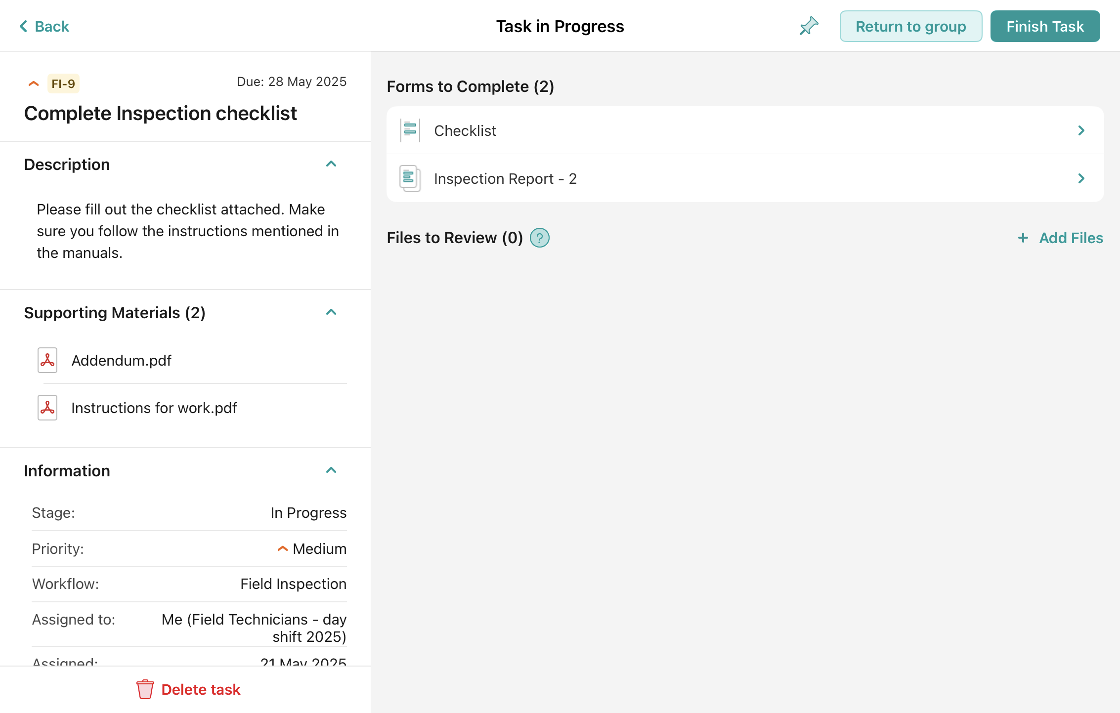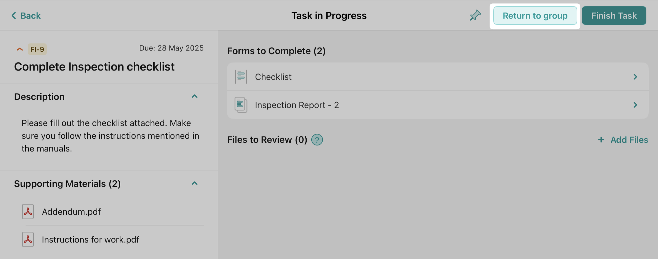 In case you are working on a task that was initially assigned to a group in which you are a participant, besides having the option to finish the task, you see an option called ‘Return to Group’.