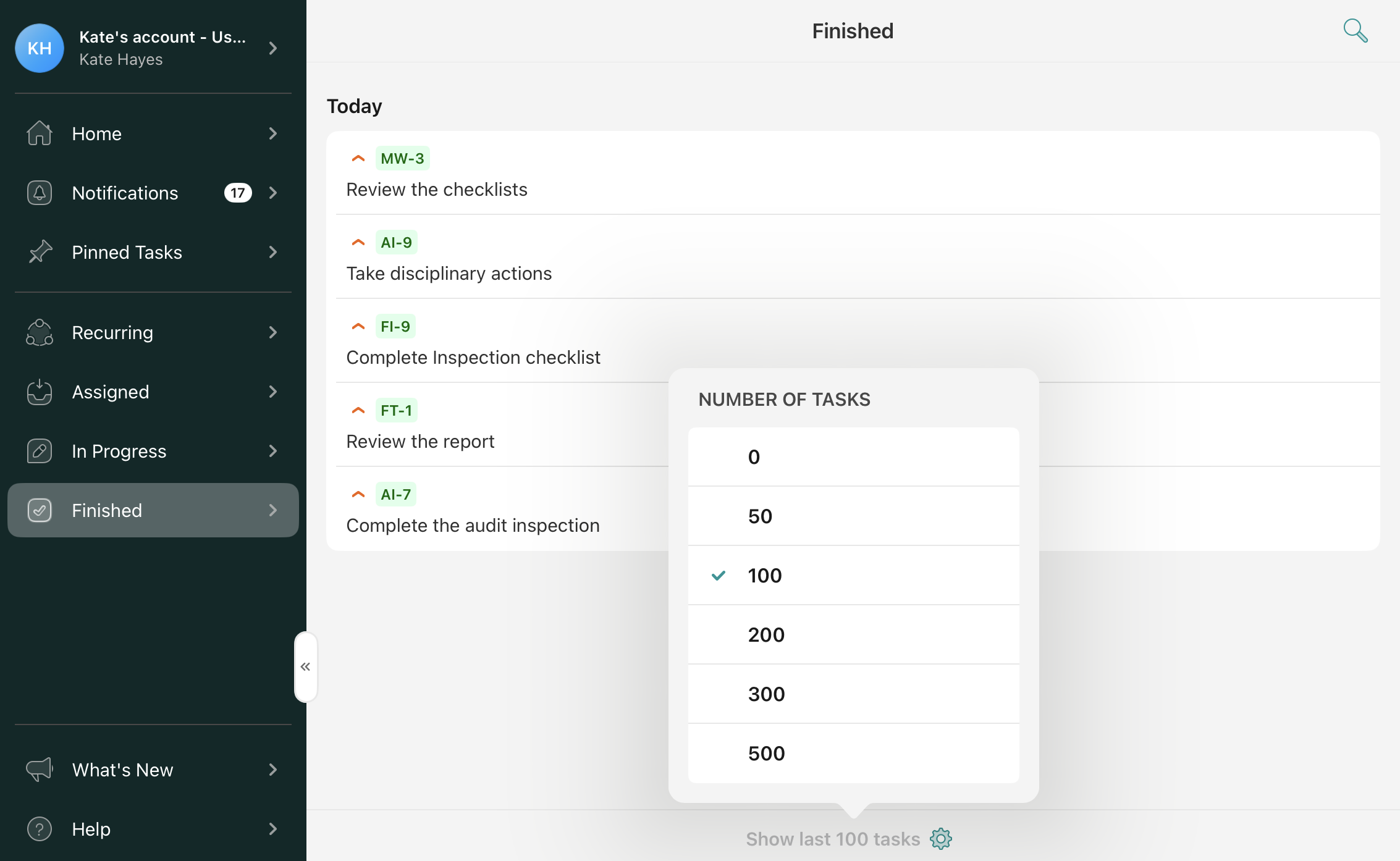 In the upper right corner of the Finished section, use the Search icon to locate the tasks you need to complete.