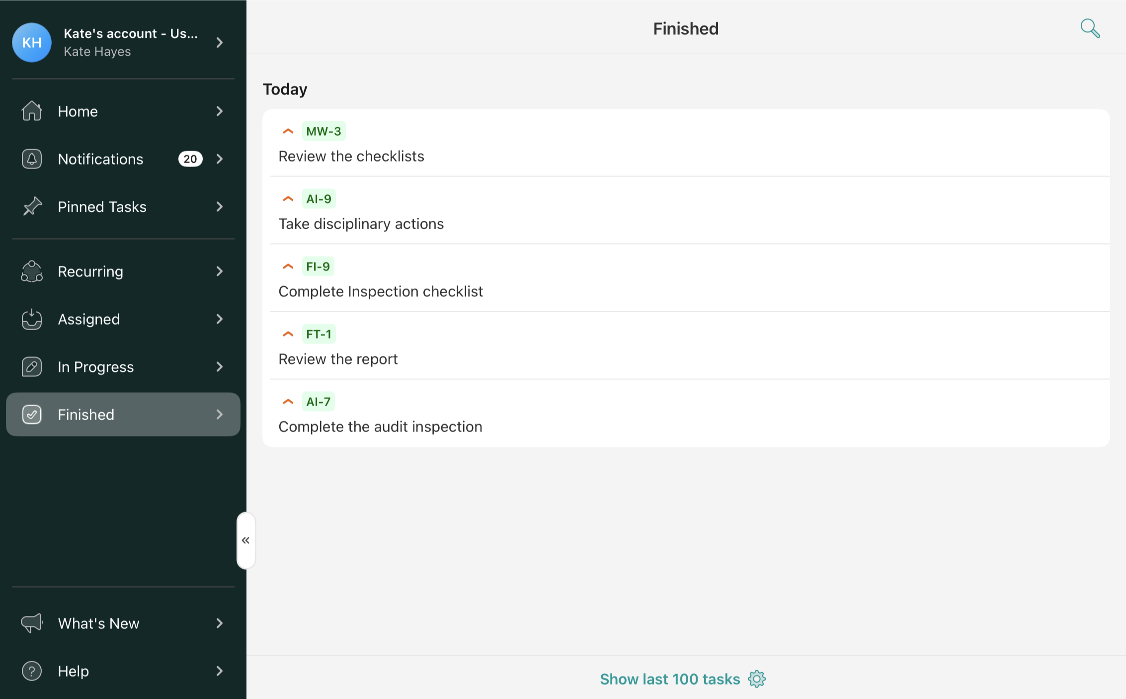 The list of tasks is sorted by date and separated into sections based on the date each task was finished.