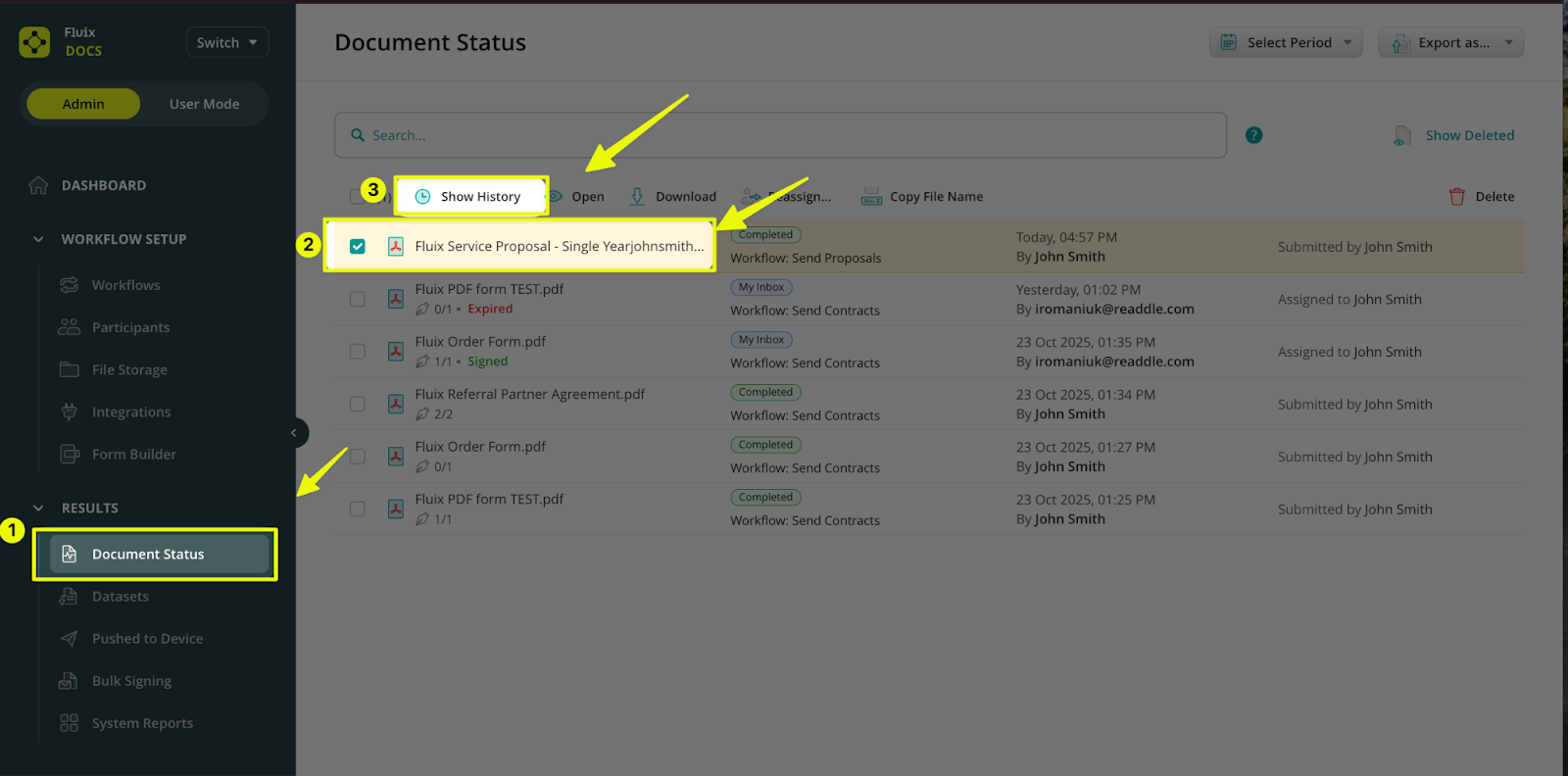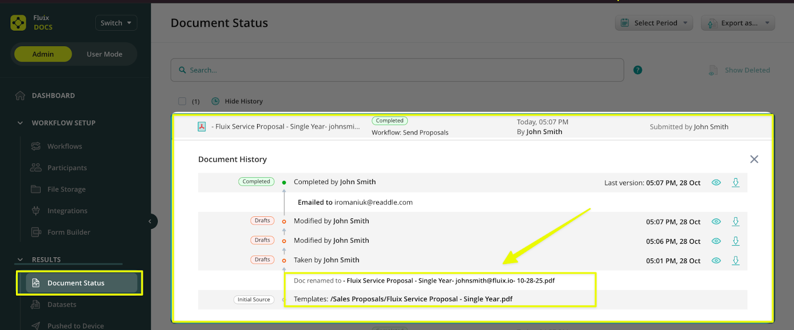If you navigate to the Document Status section of the Admin Portal, select the document for which you would like to view the history and user actions, and click Show History. A pop-up window will then display all available document versions that can be downloaded at any time.