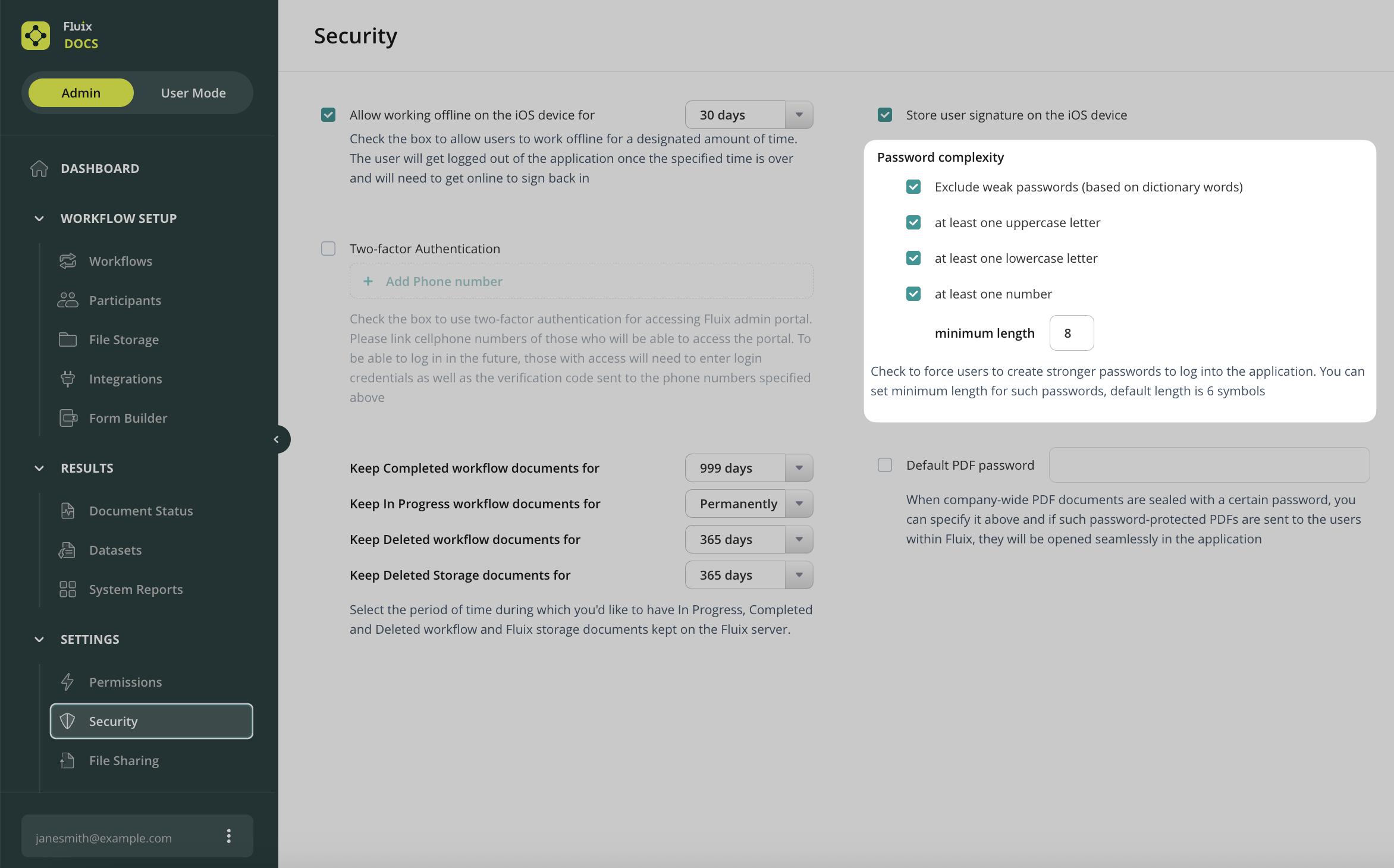 Please note that you can define the password complexity for the usersā passwords. This option is available in Settings-> Security.