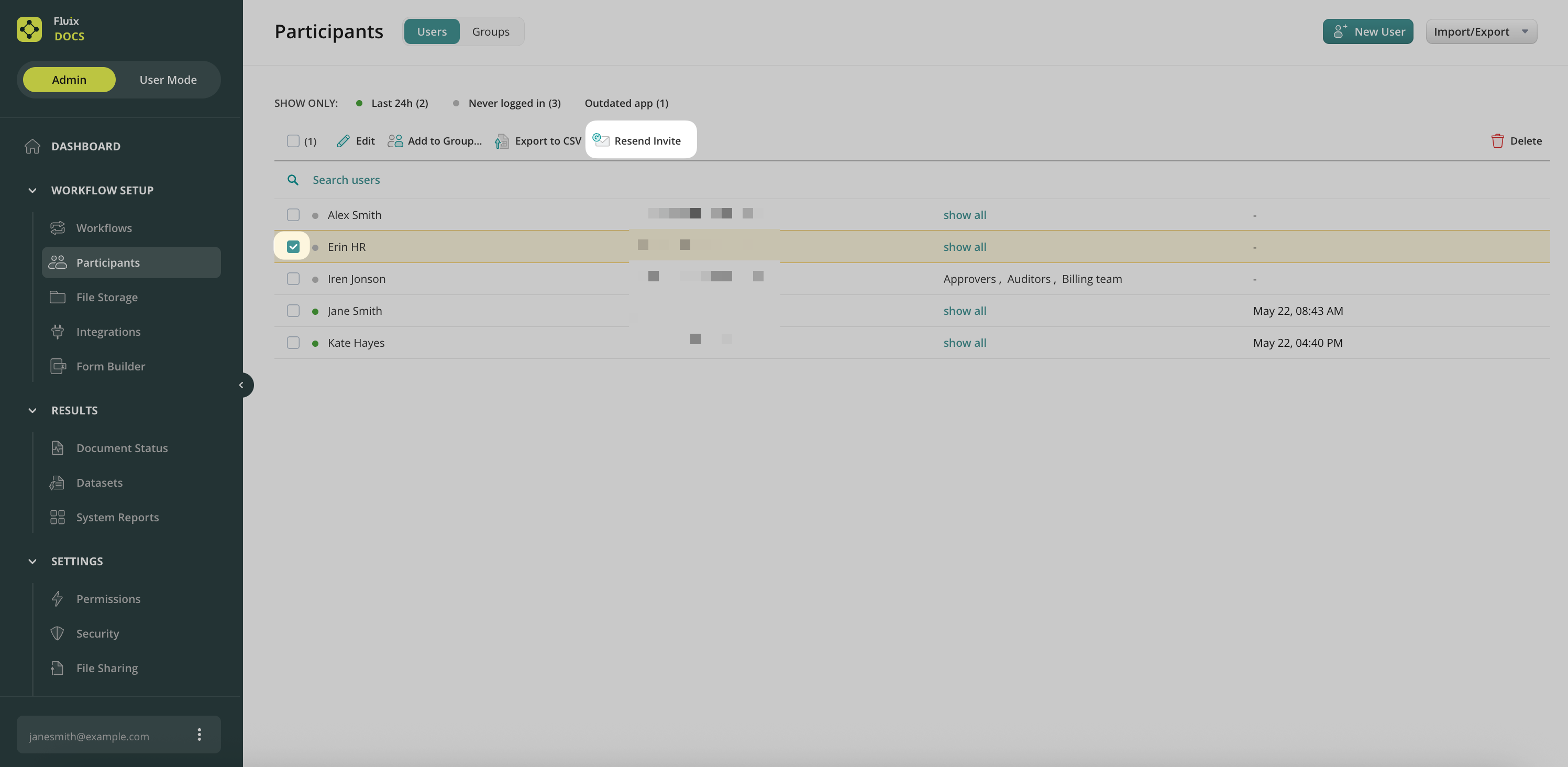 The invitation to access Fluix will be sent again to the selected user who hasnāt logged into the application yet.