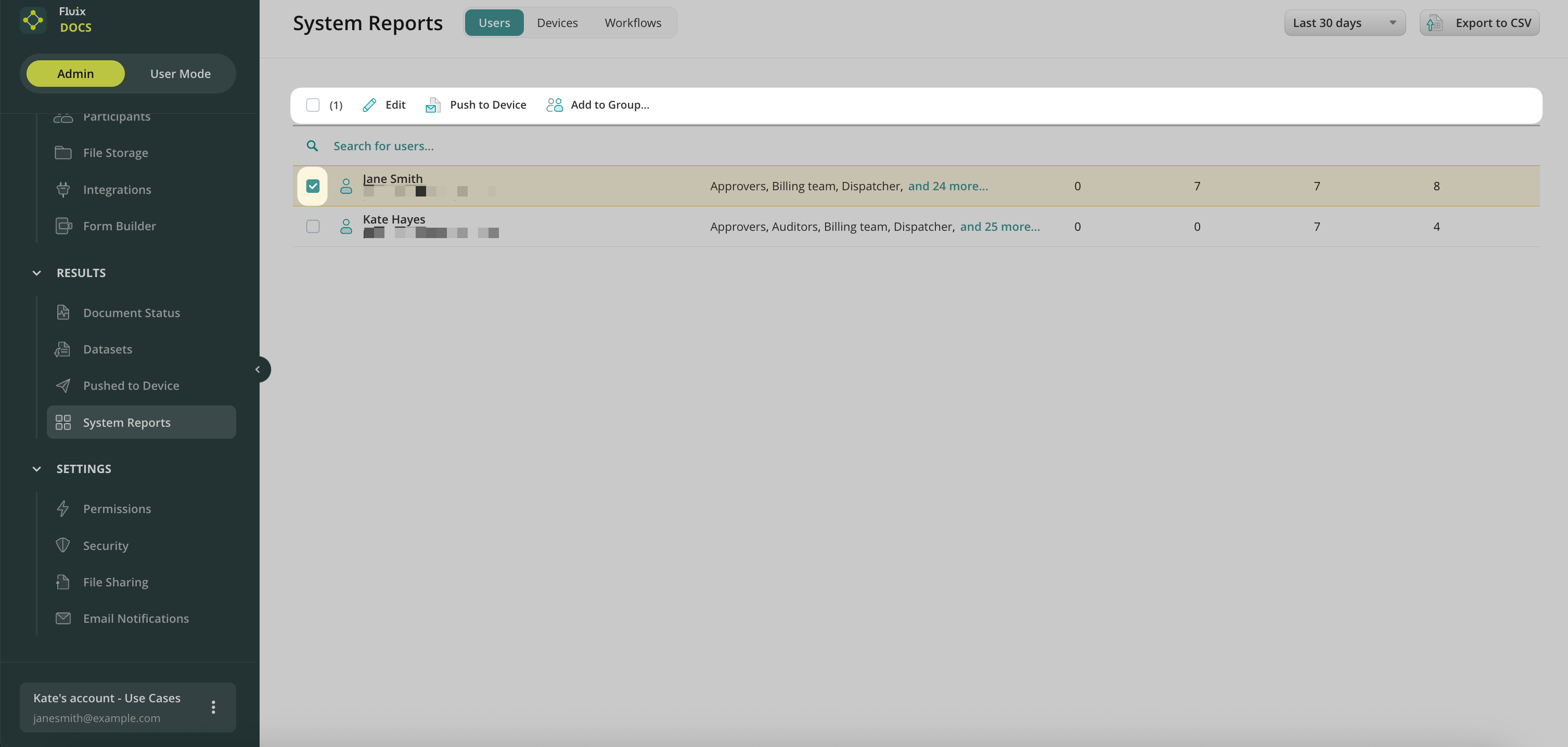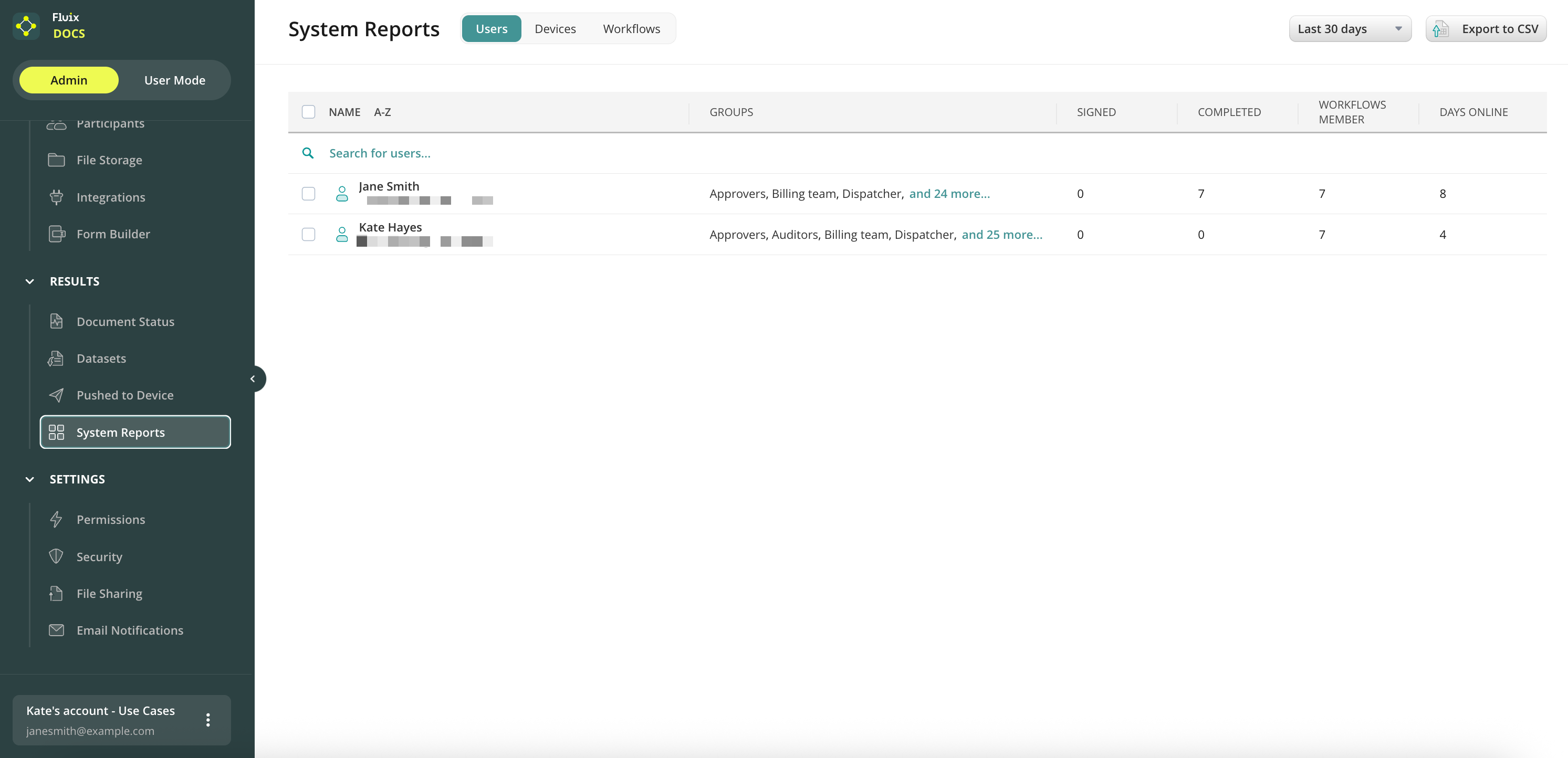 In the System Reports tab of Results section, you can check certain user-related metrics e.g. the number of signed and completed documents, how many workflows each user participates in, last login date. To make the report more specific, you can select the period of time in the top right corner.