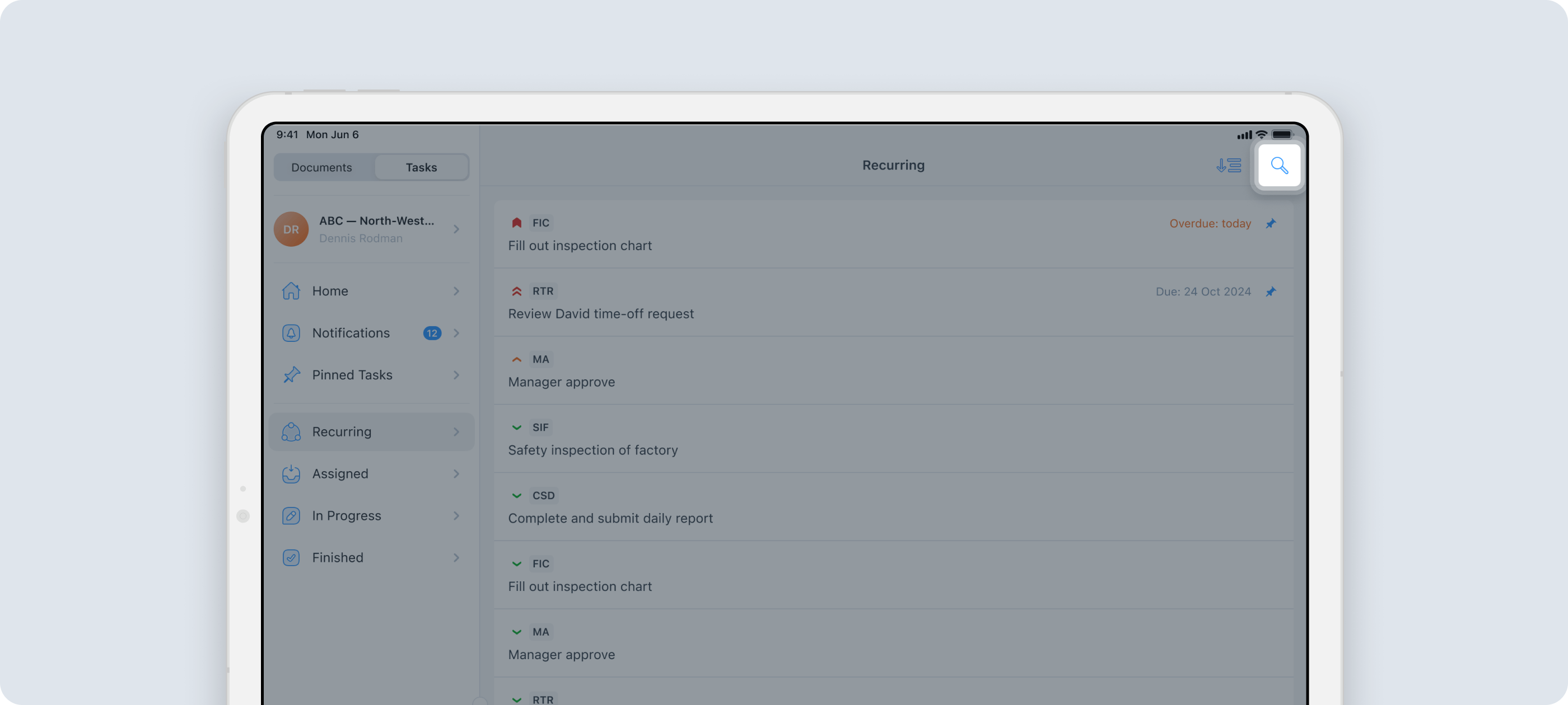 - Search in Tasks: Quickly find tasks across all tabs: Recurring, Assigned, In Progress, and Finished.