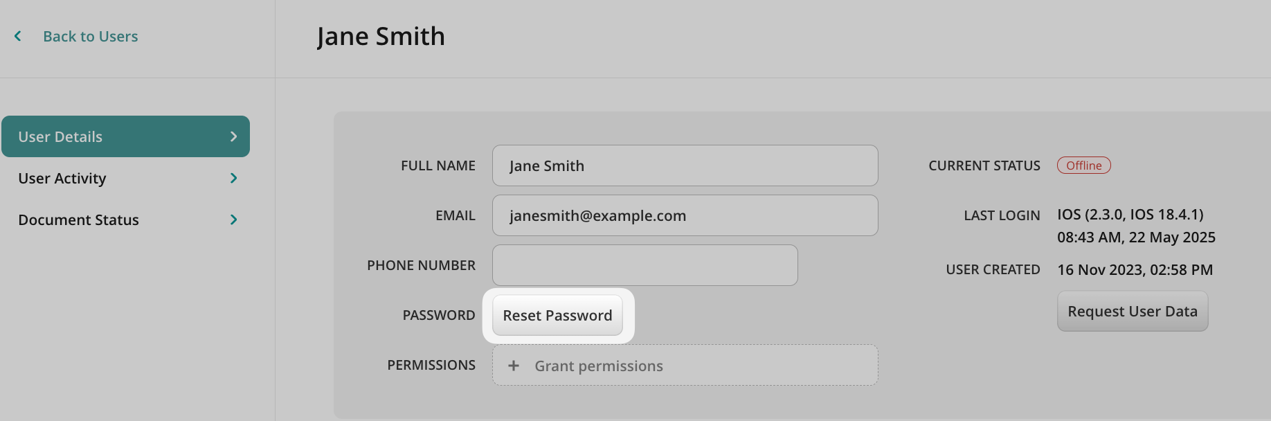 Step 1. Click on the User who can’t log in and you will be taken to the User’s page. There, click on the Reset Password button.