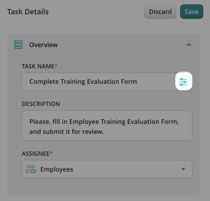 Task Name suggests you fill out the name of the task that the user will see on his/her device. By clicking on the Dynamic Values icon on the Task Name field, you may select the list of fields and values that you’d like to see in the task name after the user completes it.