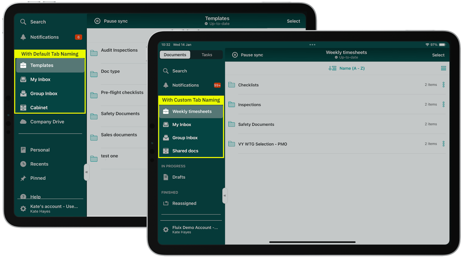 With the Customization of Tab Names feature, admins can now rename document source sections within the Fluix Docs app to ensure the interface matches your company’s specific terminology, making it easier and more intuitive for your teams to navigate the documents.