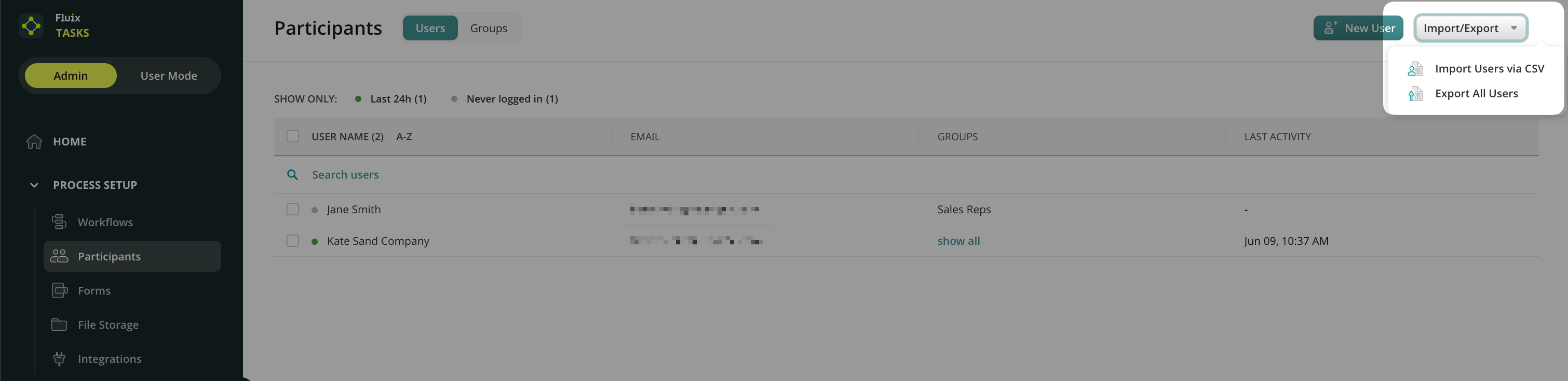 To export the list of all or selected Fluix users, please go to the Admin Tab -> Process Setup -> Participants section and follow the steps for each option below: