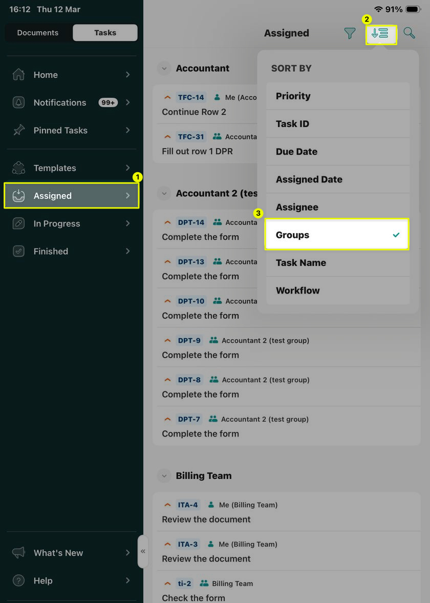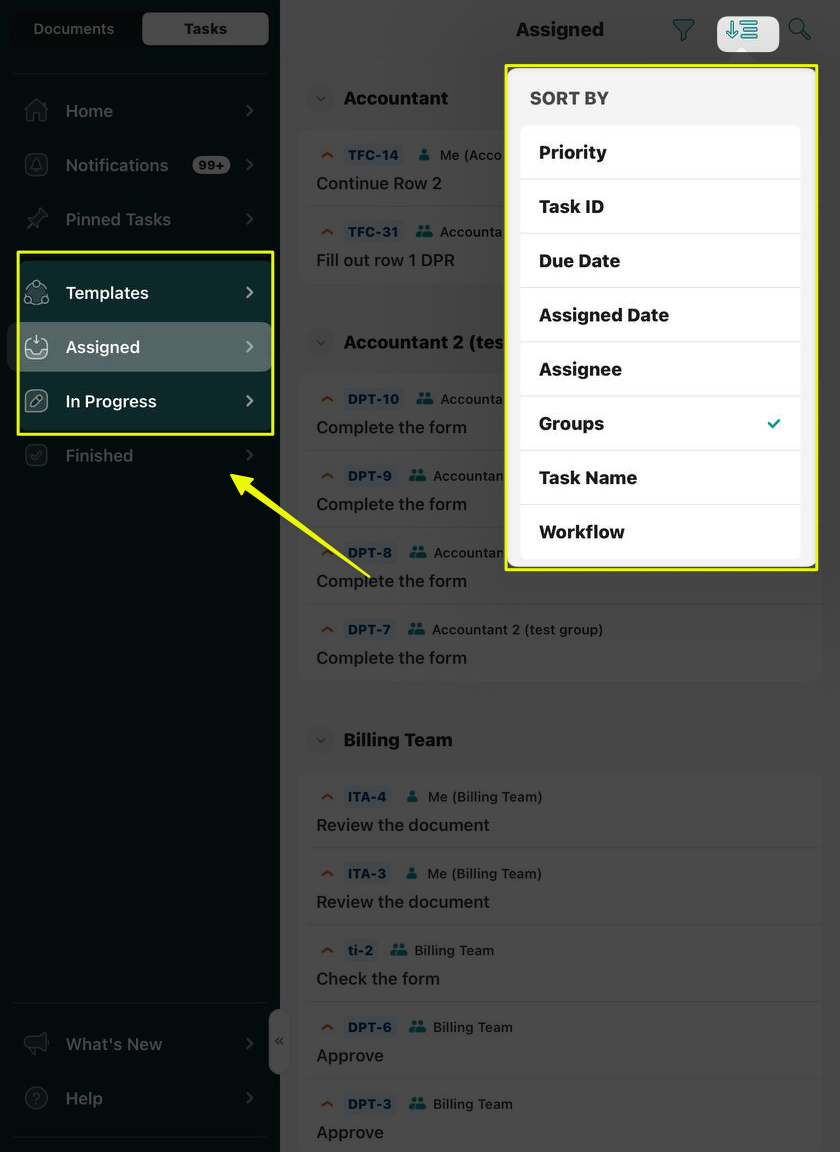 You can utilize advanced sorting parameters in the ‘Templates,’ ‘Assigned,’ and ‘In progress’ sections on your device and sort tasks by specific parameters: