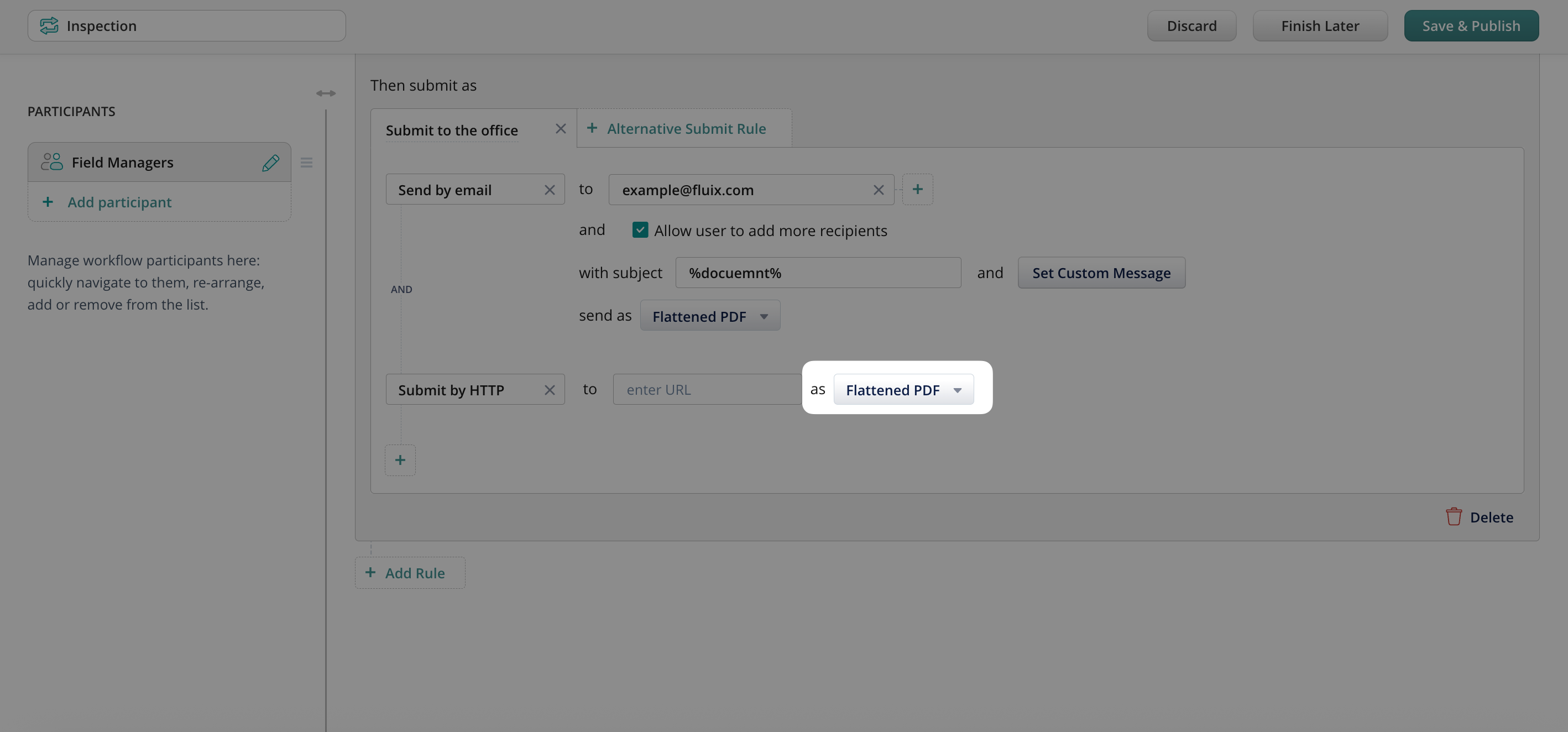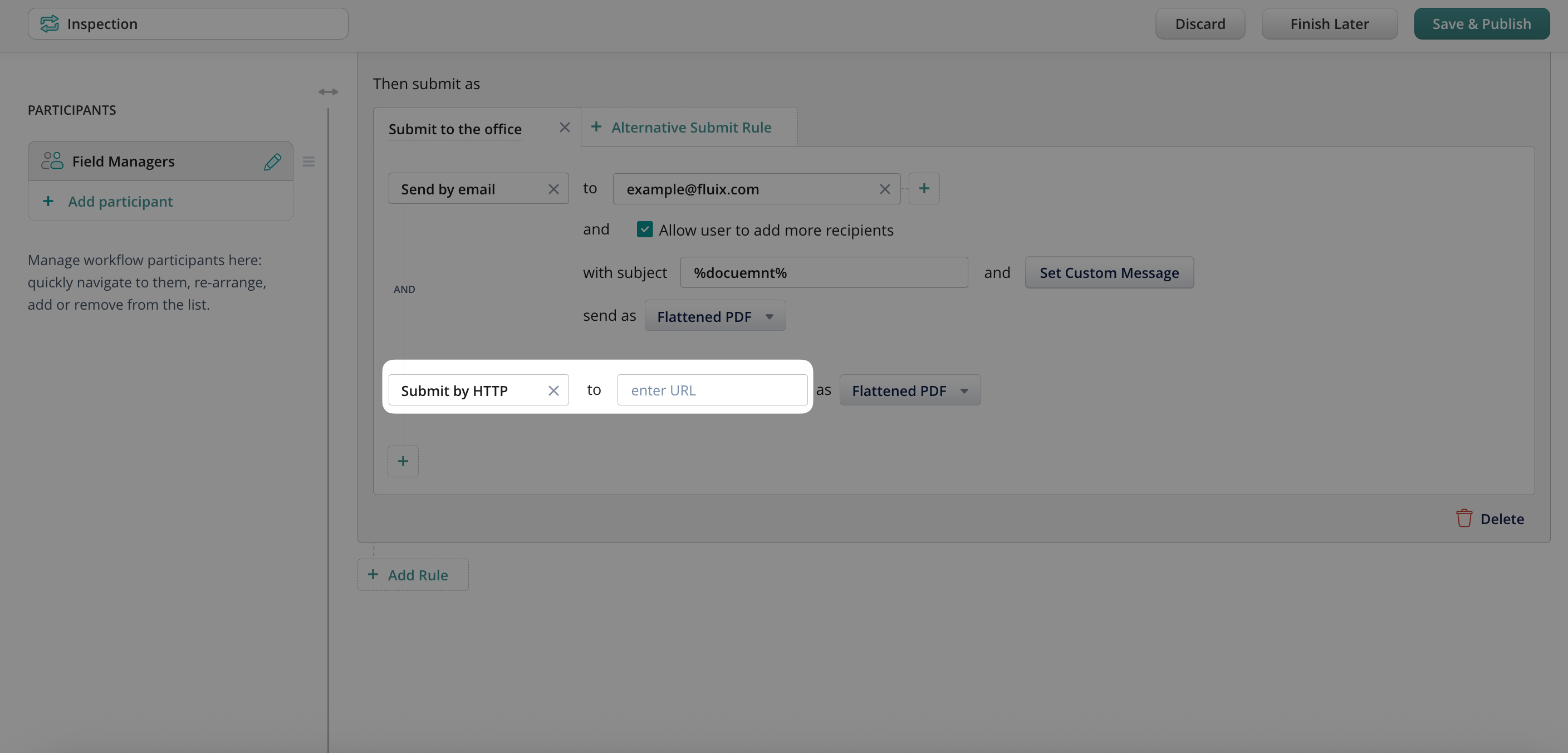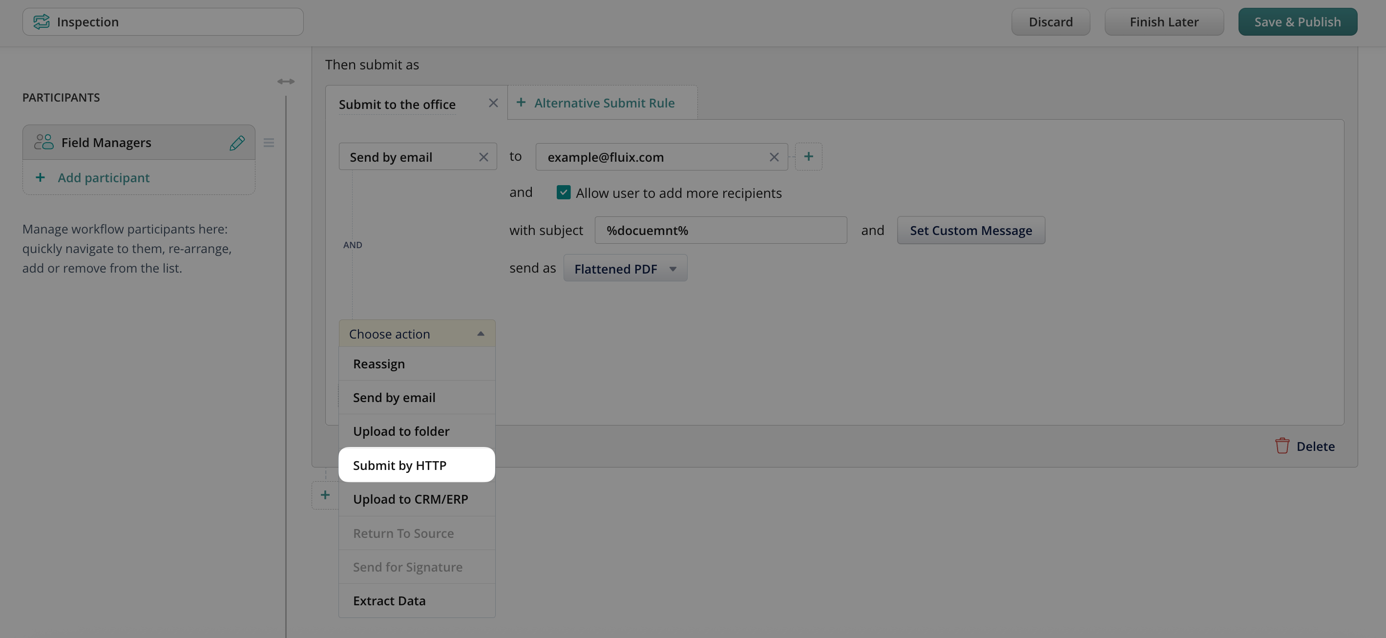 HTTP Submission enables Fluix to send form data directly to an external endpoint once a workflow step is completed. For example, you can use it to: