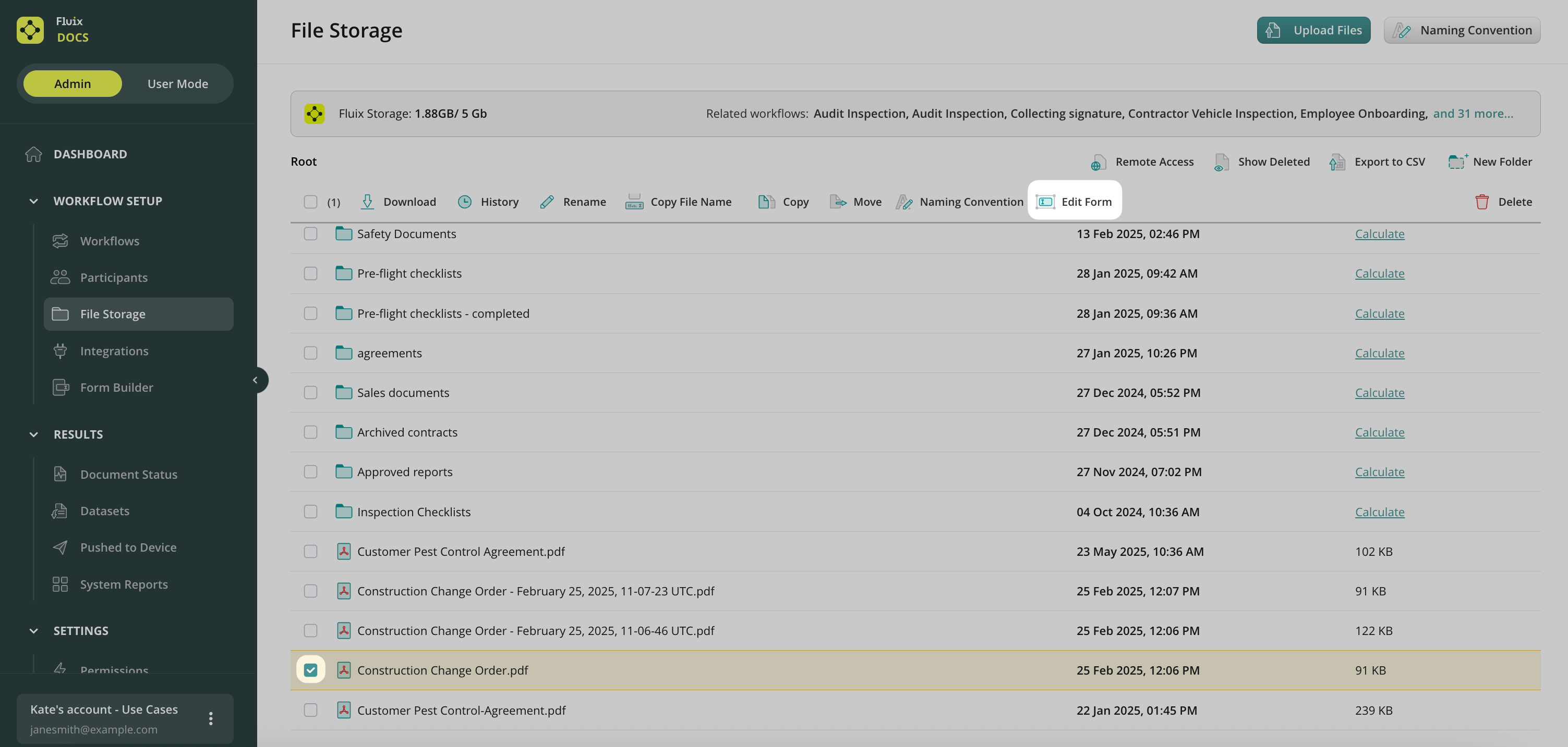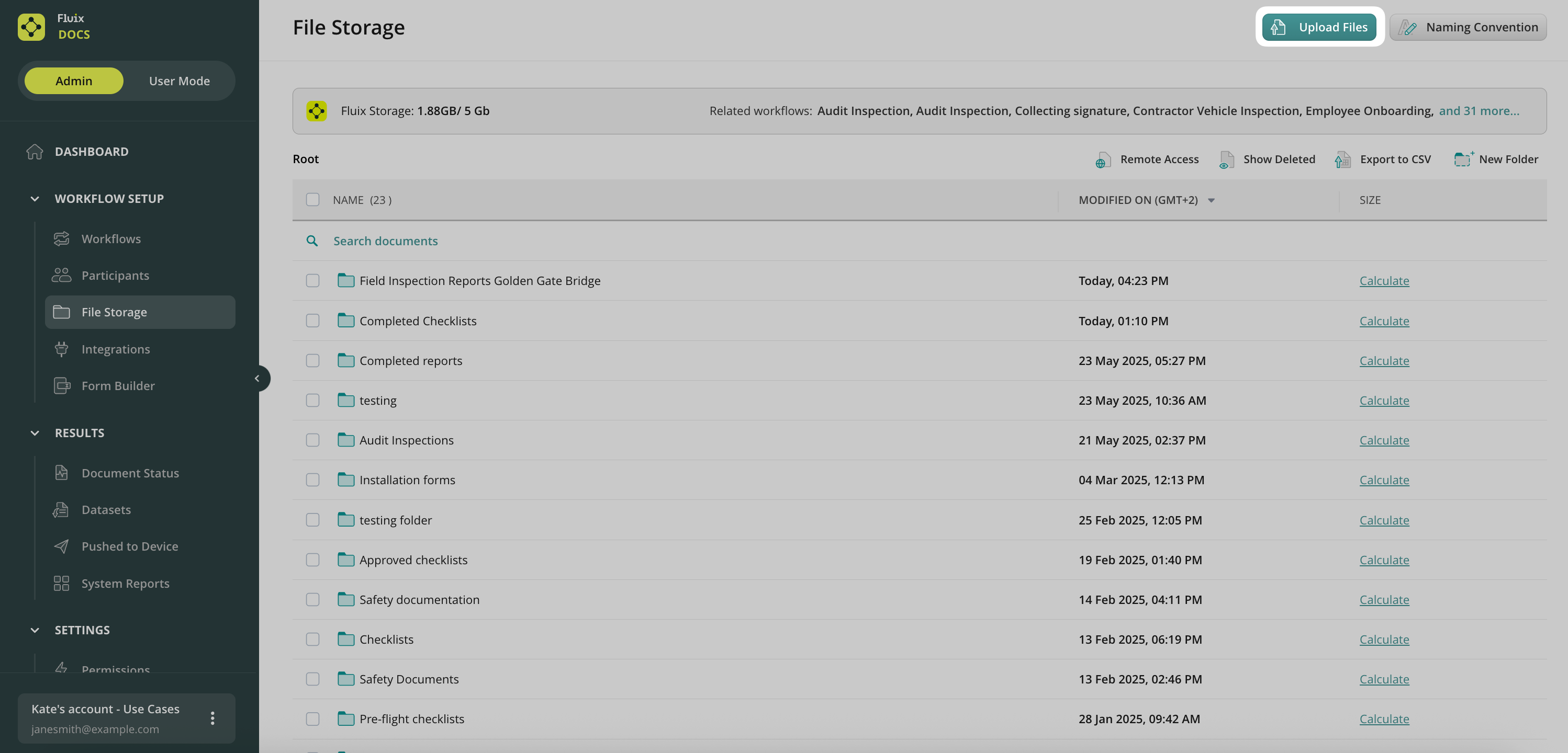 Besides creating forms from scratch, you can also add text and signature fields to already existing PDF forms. To do that, navigate to the File Storage section and upload your existing PDF using the Upload Files button.