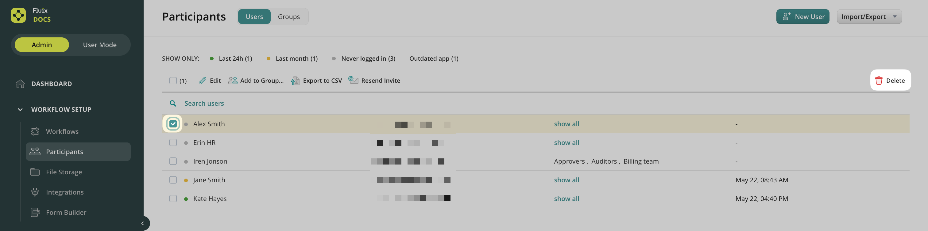 To export the list of all or selected Fluix users, please go to Participants->Users in the Workflow Setup section and follow the steps for each option below:
