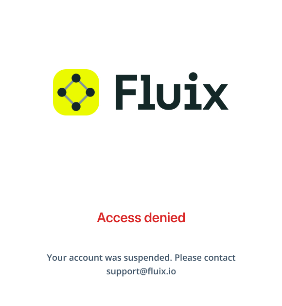 Once suspended, Admin will see a popup message on the Admin Portal, saying ‘Access denied. Your account was suspended. Please contact support@fluix.io’: