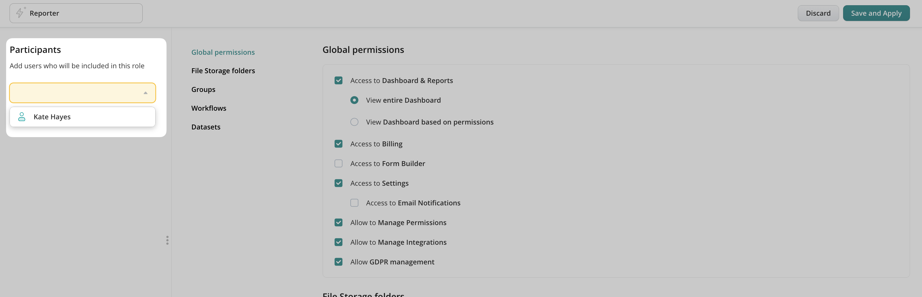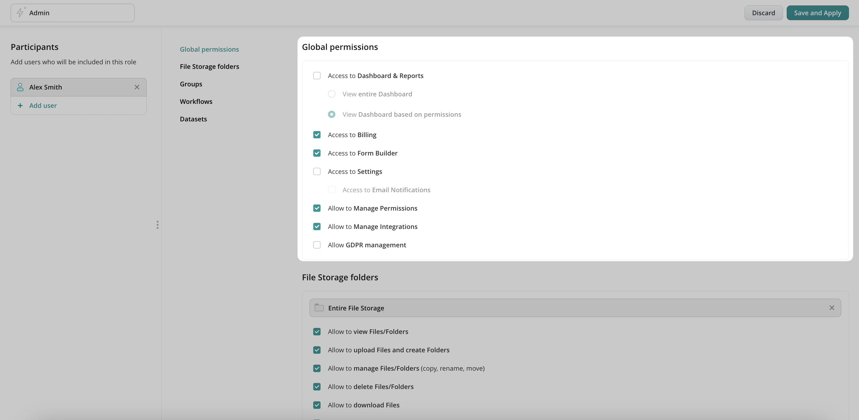 Global Permissions: This section gives access to the main areas in Admin Portal such as Dashboard, Billing, Settings, Roles, Remote Storages,and GDPR.