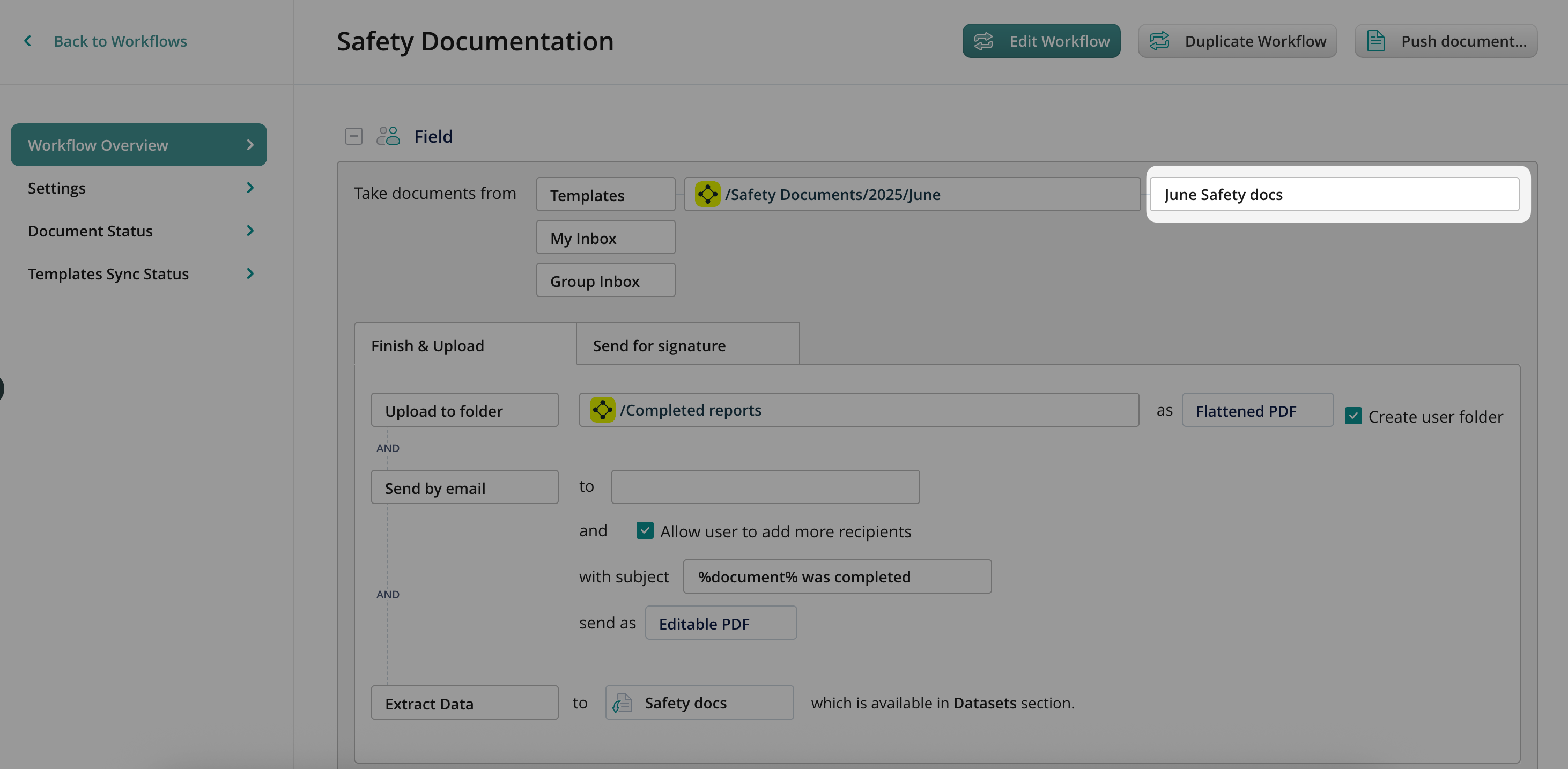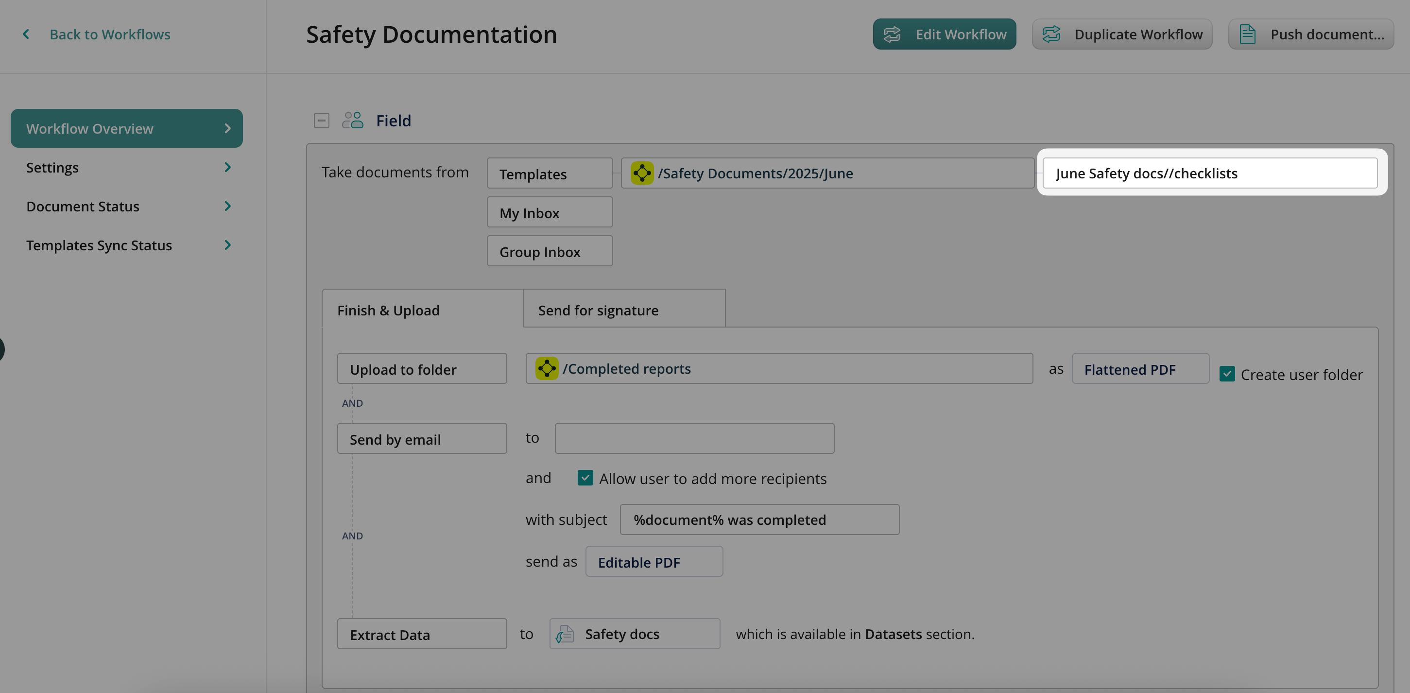 Such a virtual folder structure can be created on the level of Templates, Cabinet, Company Drive, and Group Inbox. For doing this the Fluix admin needs to create the label folder on the workflow level: