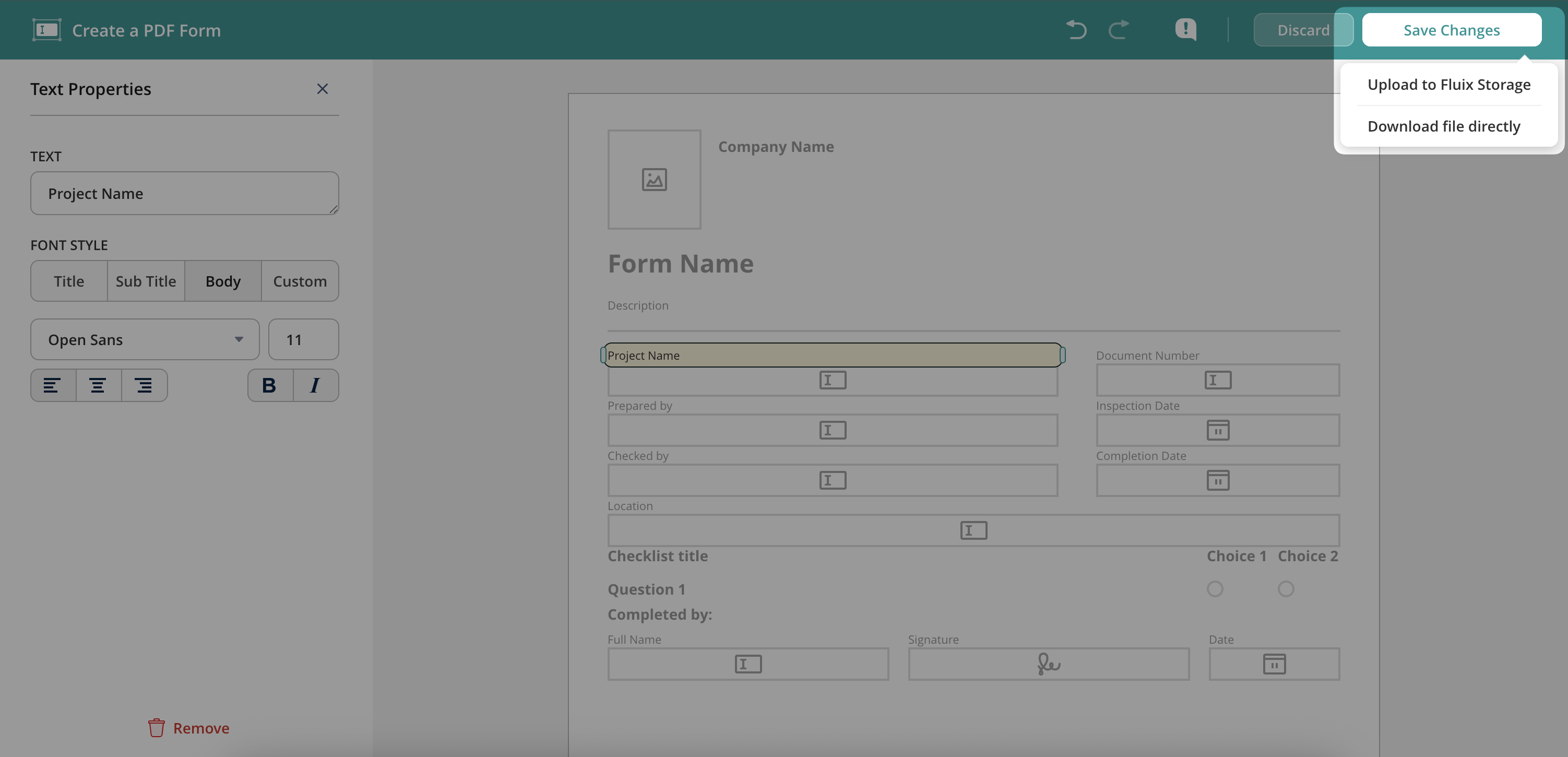 Once the form is ready, click Save Form in the upper right corner. You will be prompted to select how you would like to save the form: Upload to Fluix Storage or Download file directly.