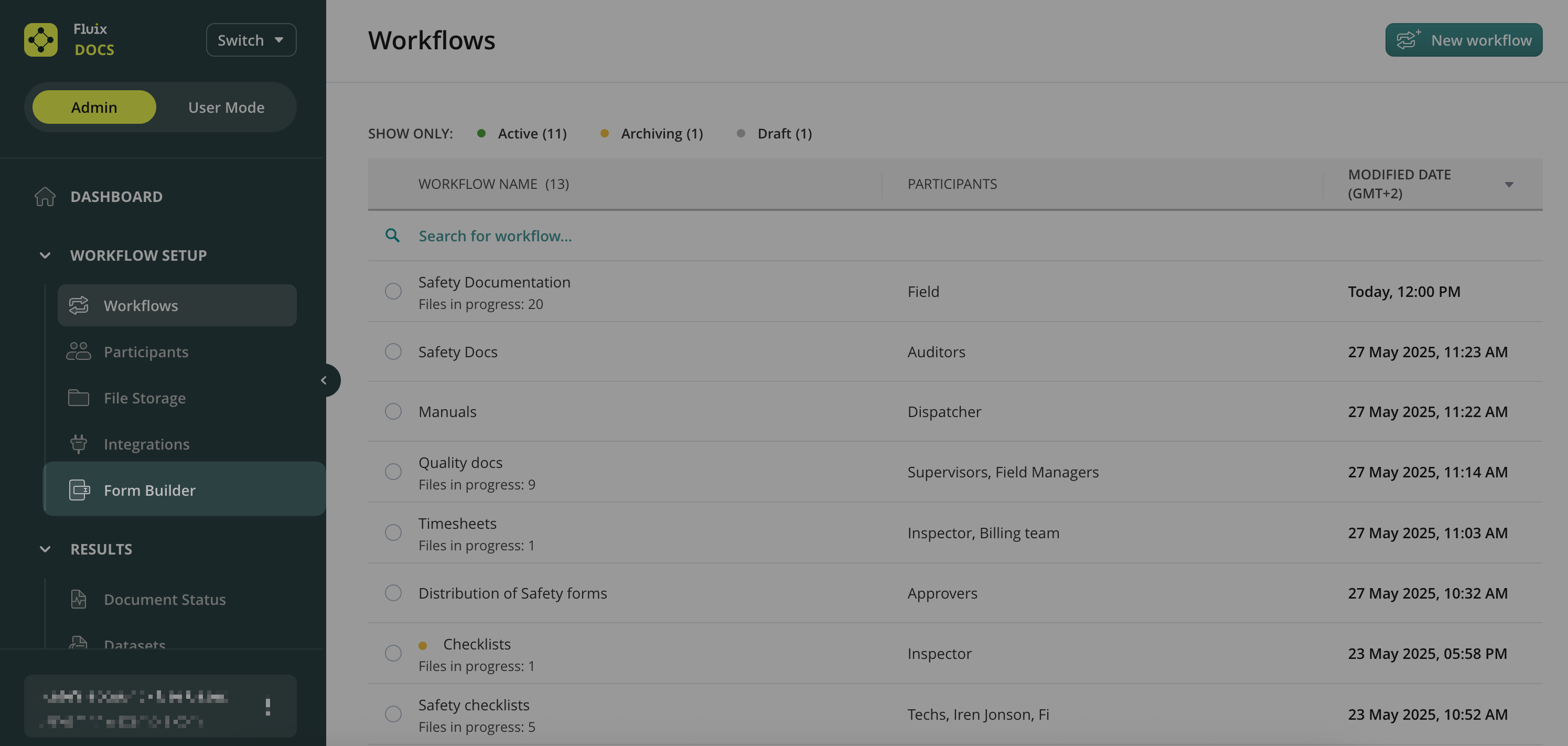 To create a web form in Fluix Docs, navigate to the Workflow setup section -> Form Builder.