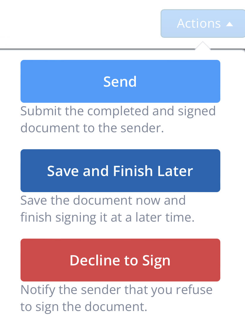 The recipient will have a choice to fill out highlighted fields and sign the documents, just sign the documents, finish later, or refuse signing.