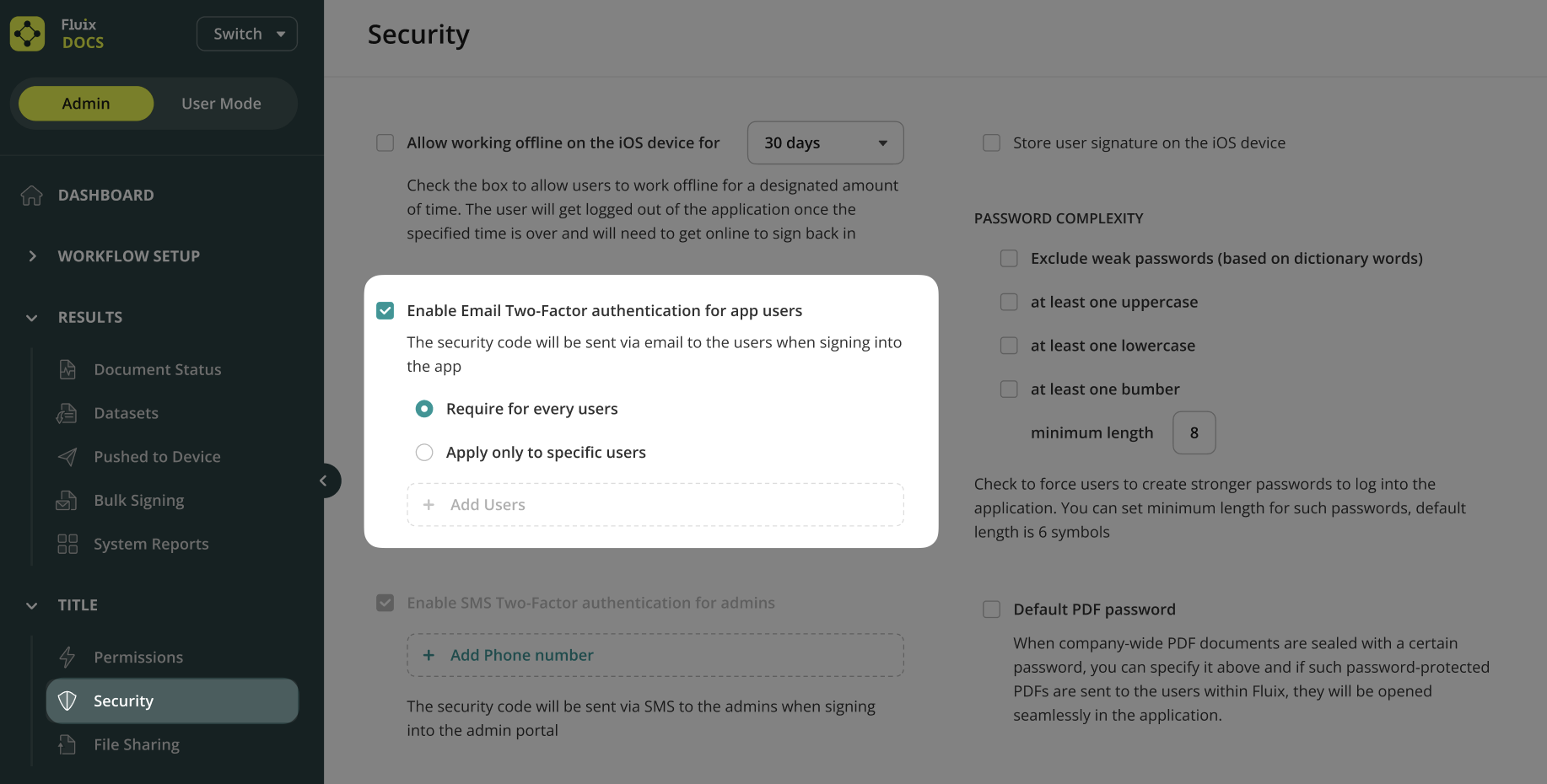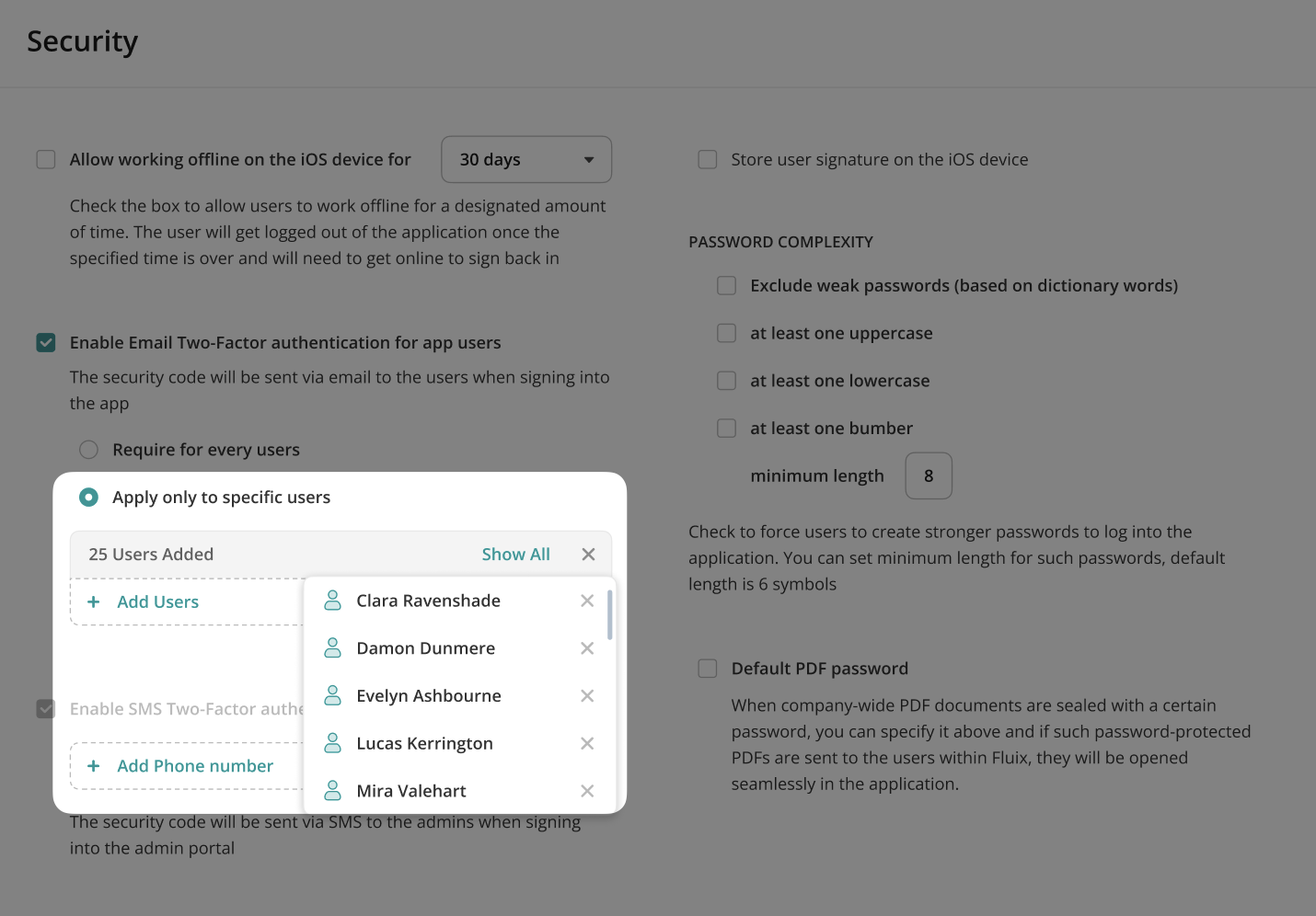 Email 2FA for app users is disabled by default. When enabled, it can be applied either to all users, which is the default behavior, or only to specific users. Admins have the ability to add users to the specific users list and remove them from that list at any time.