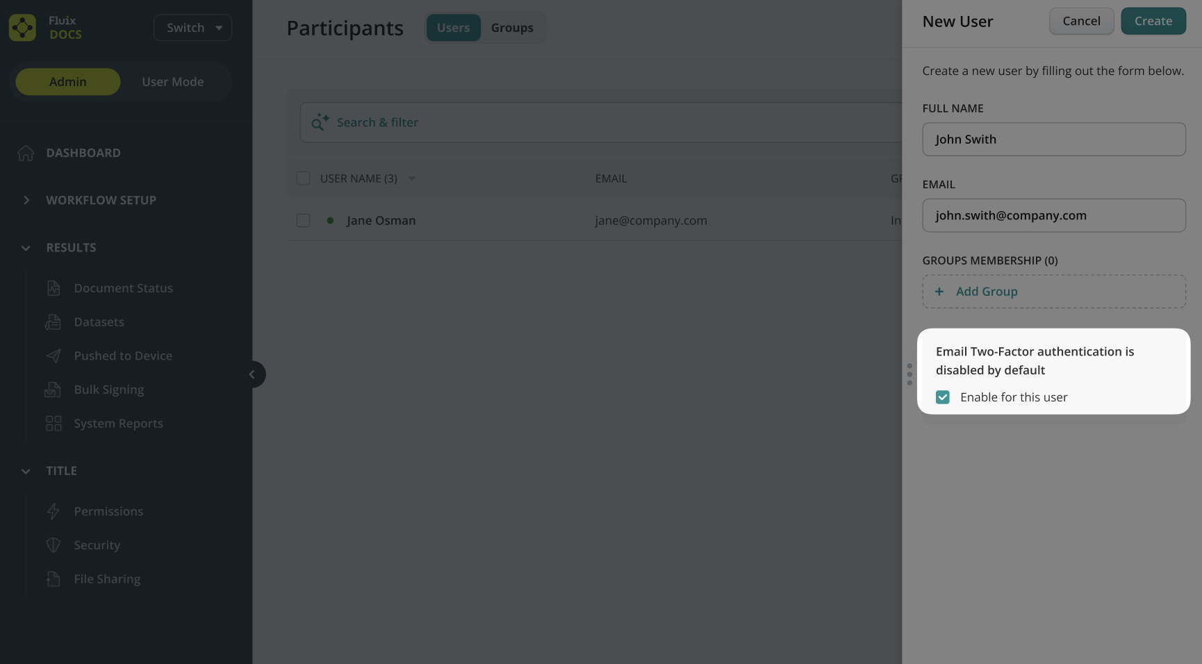 If Email 2FA for app users is disabled, admins can still manually enable 2FA for a new user during the account creation process. If Email 2FA is already enabled for all users, the admin will be informed during new user creation that 2FA is active automatically.