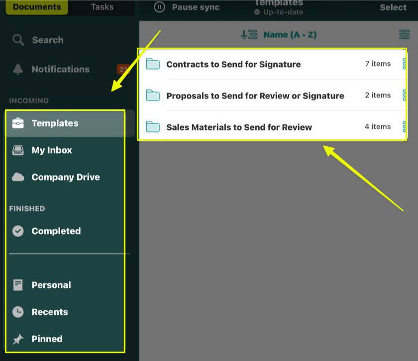 - Tap on the section where your document is located (Templates, My Inbox, Company Drive, Completed, Personal, etc).