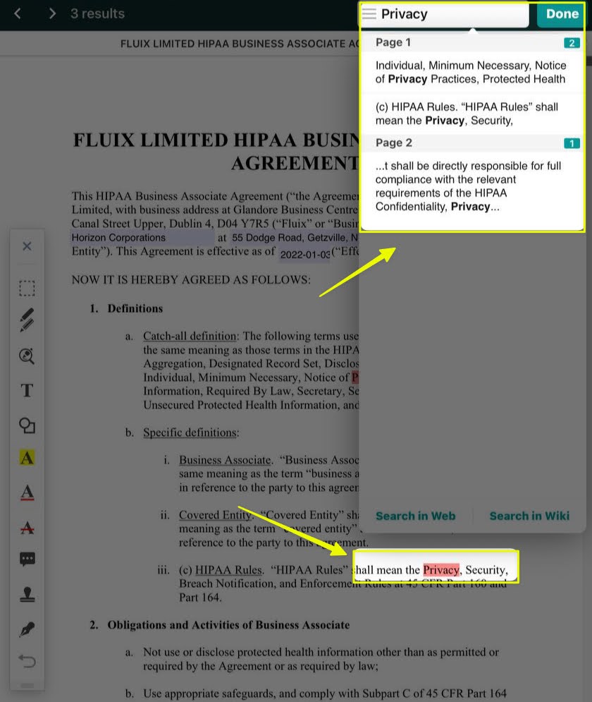 - In the search bar, type the word you are searching for in your file and click Done. The results of the search will be displayed below the search bar, accompanied by a reference to the number of pages and a brief excerpt from the document.