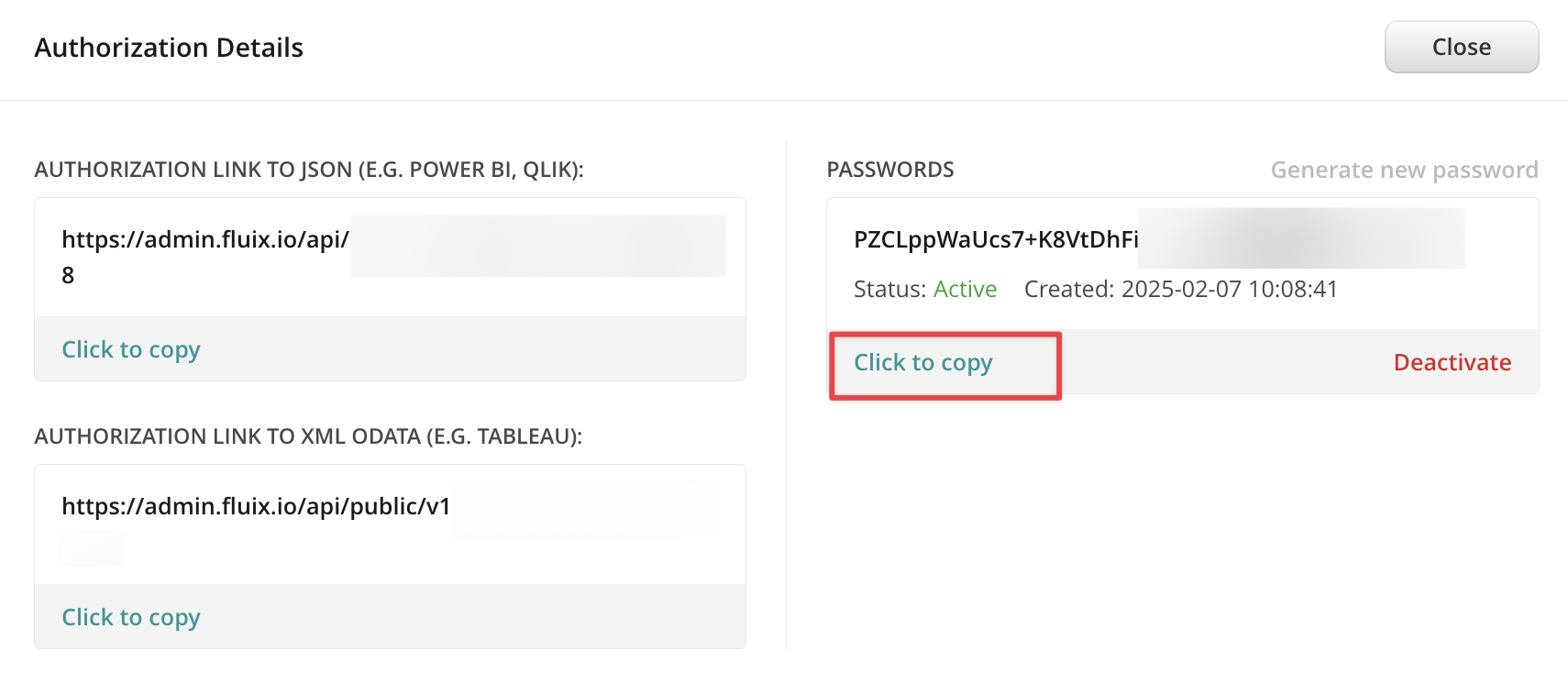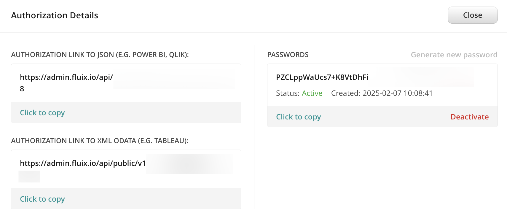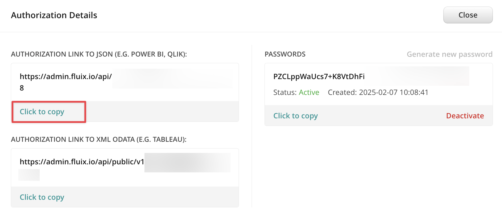 8. In the Fluix Export dialog box copy the first Authorization Link (Power BI) and click Continue, example: https://admin.fluix.io/api/public/v1/fdata/dataset41