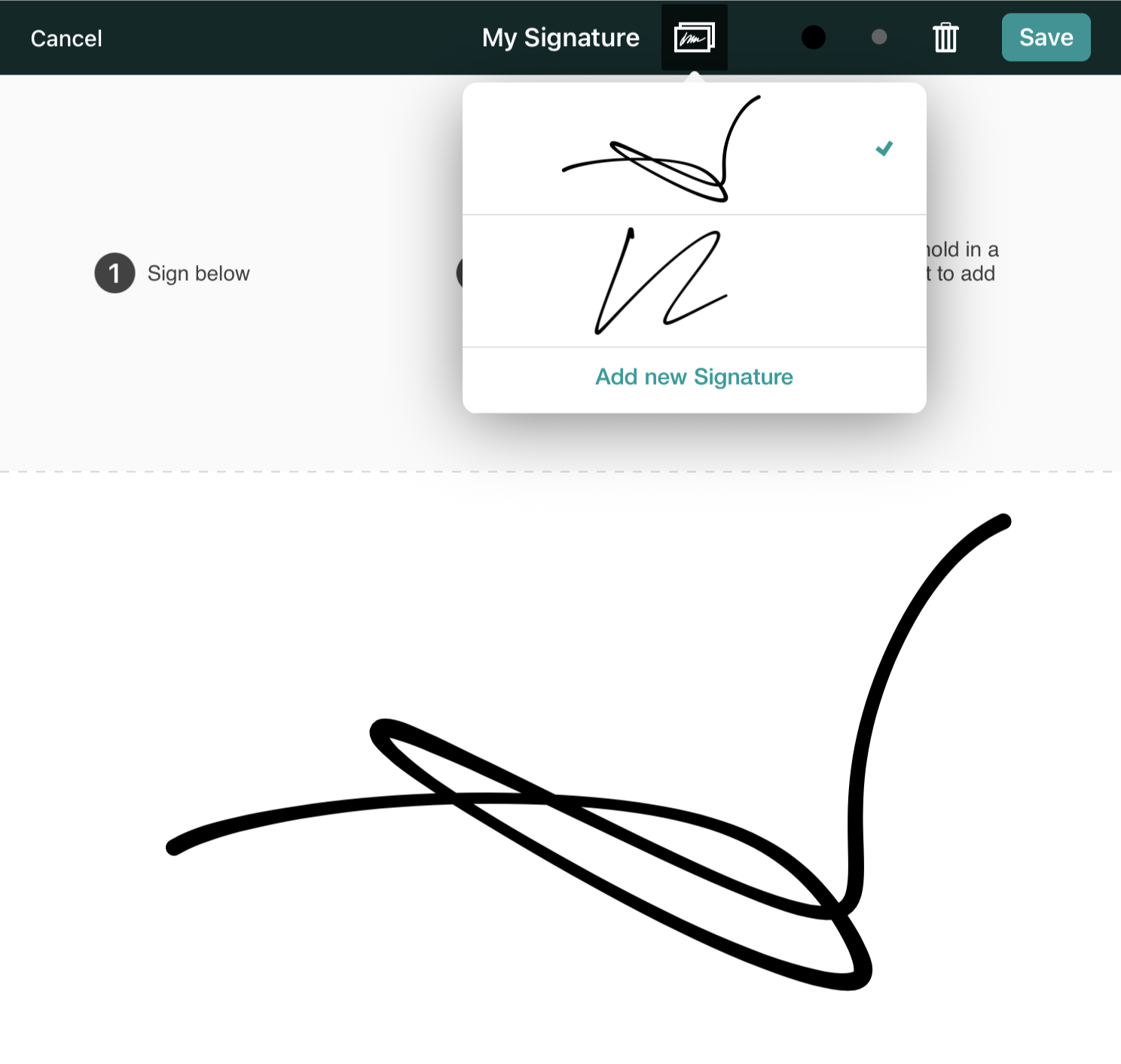 When ‘My Signature’ is selected, a previously saved signature will be placed on the document.