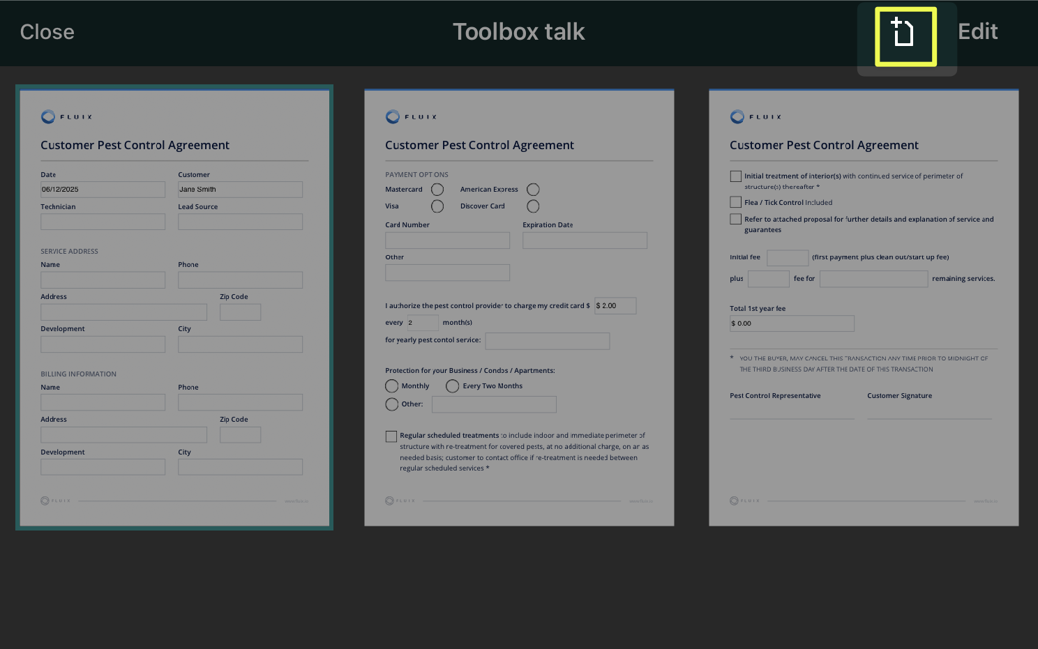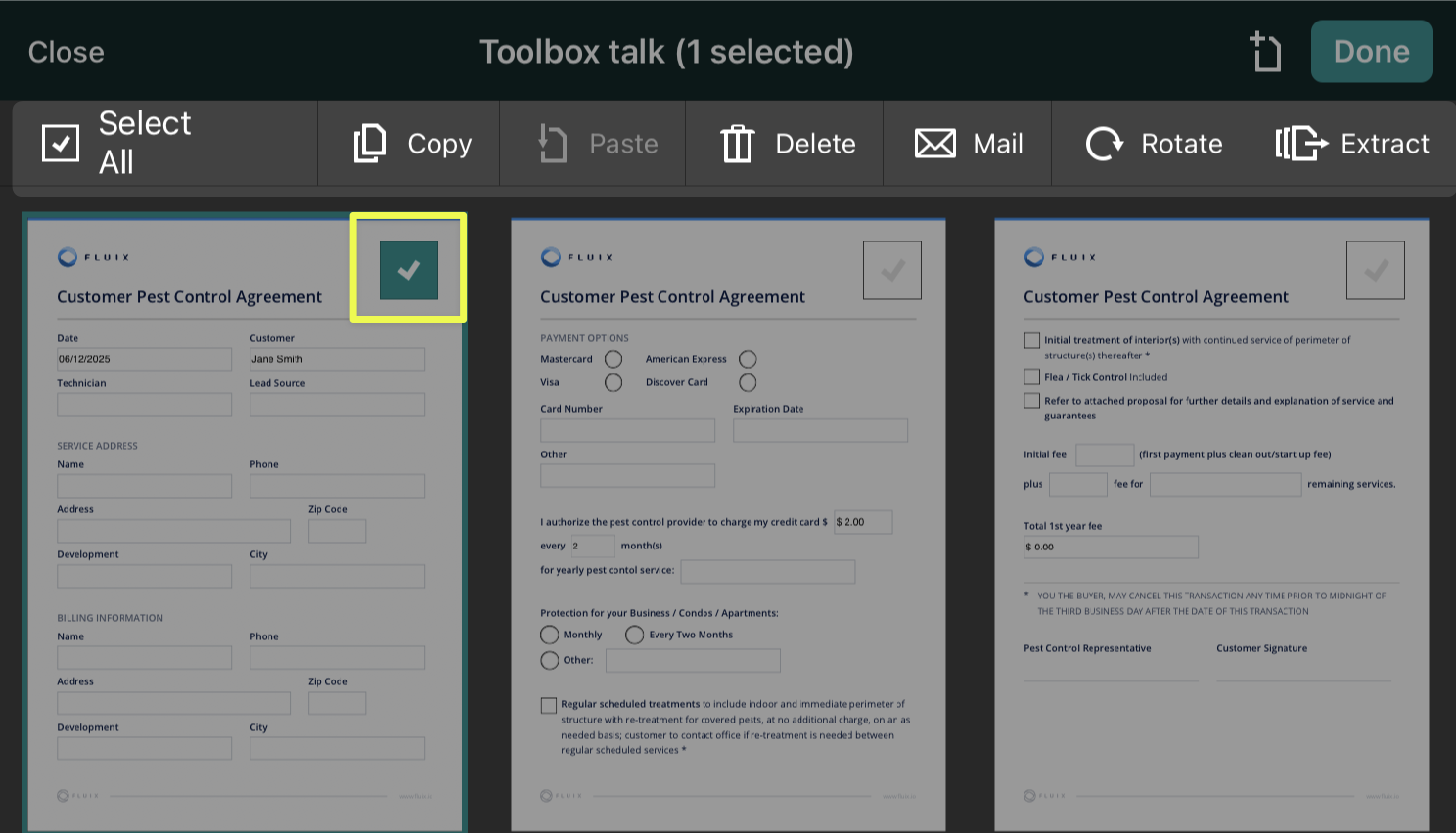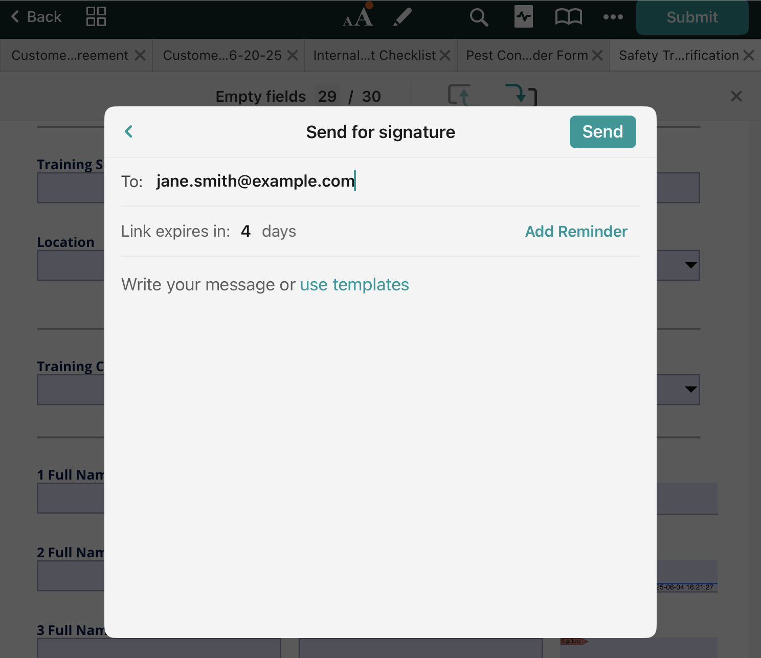 You can also add a personal comment to accompany the document. If you send similar comments to your customers, you can save them to Templates and use them each time you send a document. Please note that the templates are saved on the device locally and are not synced between your devices used to work with Fluix.