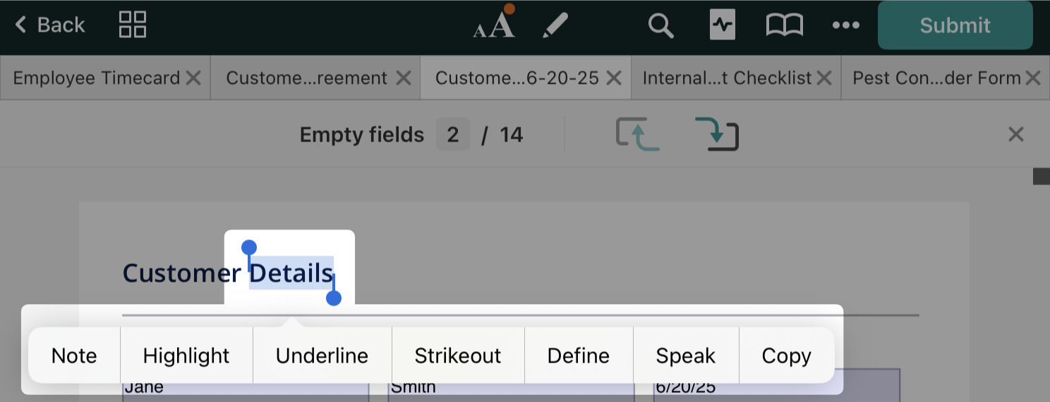 In the Fluix Docs app, when you open the PDF, you may see the ‘aA’ icon at the top. Tap on it to explore additional actions that you may configure to improve your daily work with PDFs. For example: