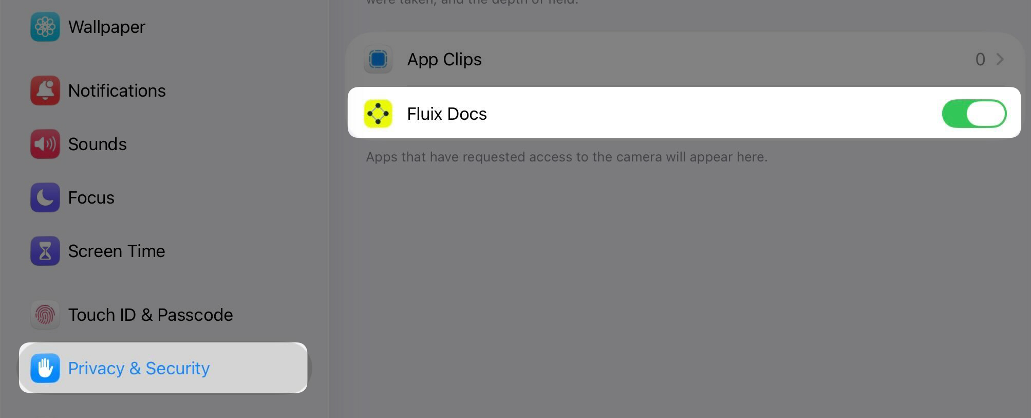 Note: You need to have your camera enabled in iPad Settings > Privacy & Security > Camera > Fluix as follows: