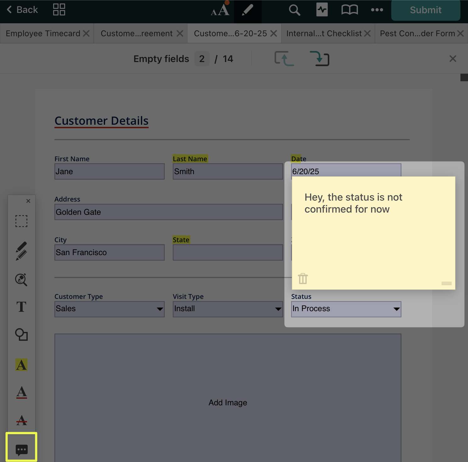 With the tool , you can add a pop-up note that will be saved in the PDFs for your teammates working with the respective PDFs. Tap on the place in the PDF you’d like to add the note and type some text. You can move the pop-up note by holding it and then dragging it.