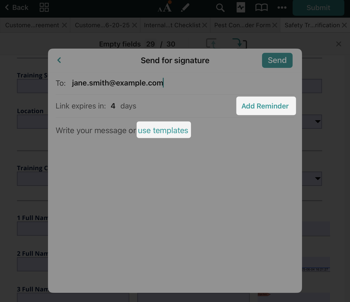 The signer will receive an email with the link to the document to be signed. By default, the link is available for 4 days. One day prior to expiration, the reminder will be sent to the signer. However, you can add a custom period for reminders by tapping on AddReminder.Â