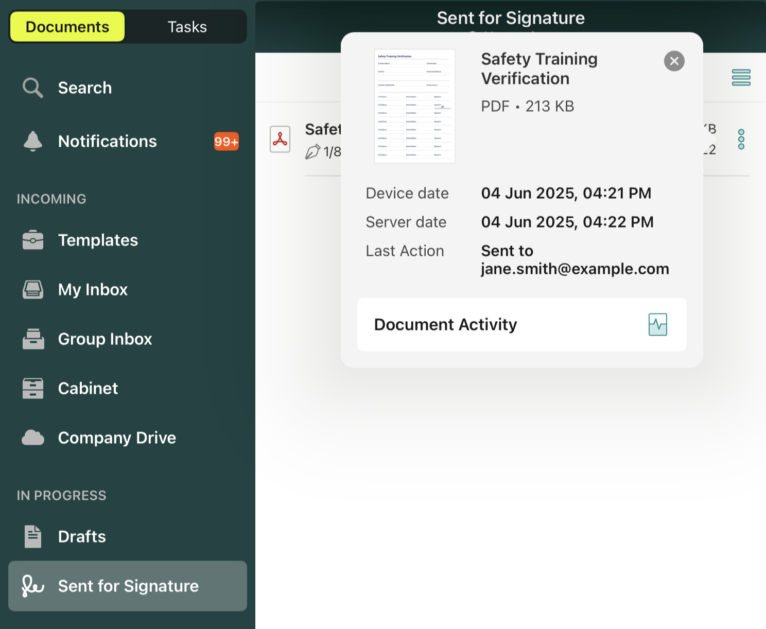 Once the document returns to the sender in the sender’s My Inbox section, it can be sent further as per the pre-configured workflow rule: emailed to other participants of the workflow, uploaded to company storage, etc. Once the document is submitted to its final destination, it will land in the Completed tab on the device.