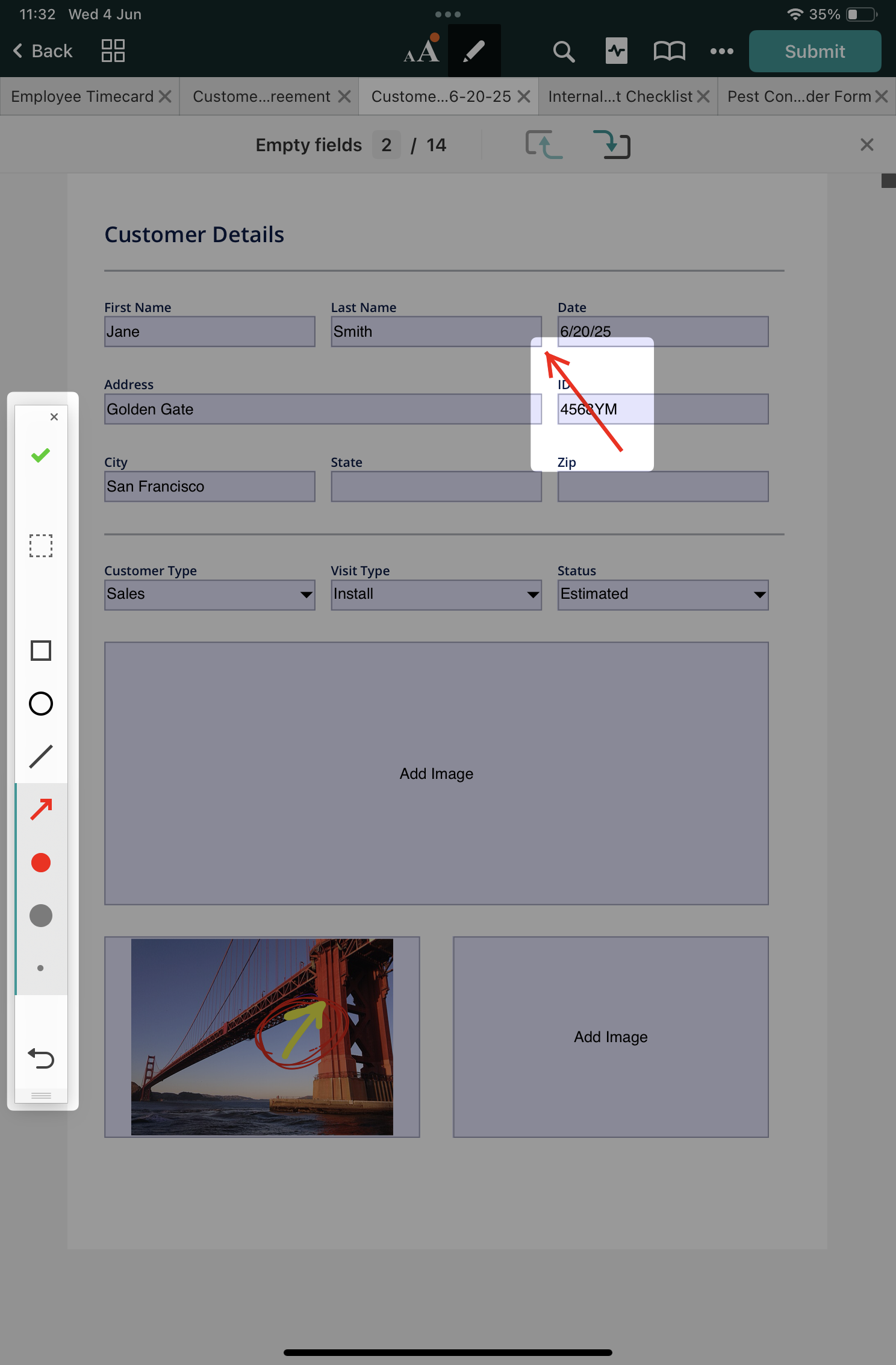 Open a document to be signed, fill it out, and tap the Submit button in the top right-hand side corner.