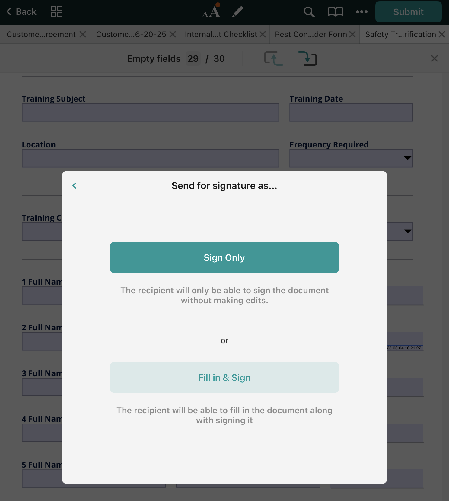 In case a signer has only to sign a document and is not expected to make any changes, choose Sign Only to restrict editing of the document. If you want the signer to fill out other fields, select Fill in & Sign.