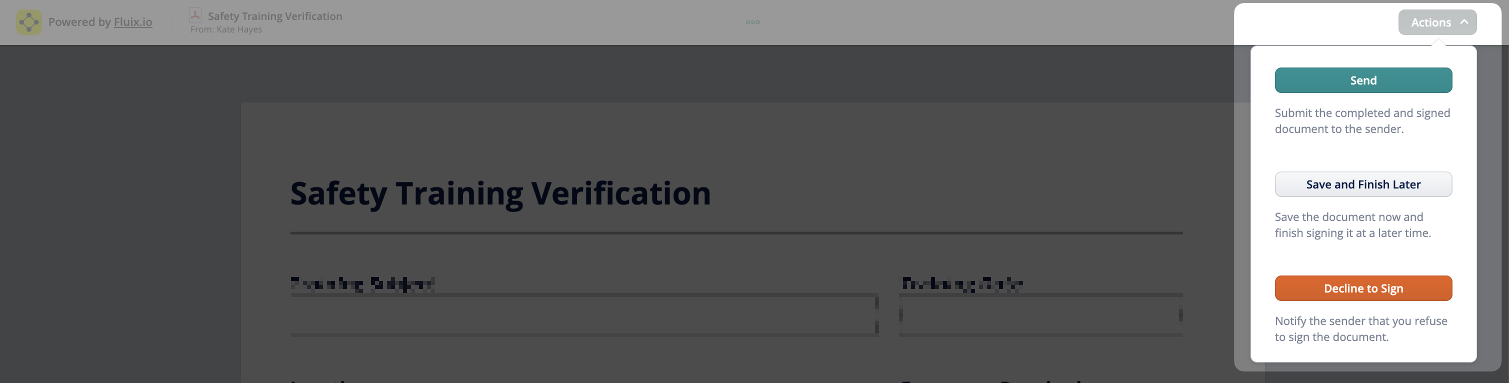 Once the signer clicks Open and Sign, they can open the document in the browser on any device. To sign a document, the signer taps on the respective signature field in the form and draws their signature. From there, the signer has three choices under Actions: Send the document back to the sender, Save and Finish Later, or Decline to Sign.