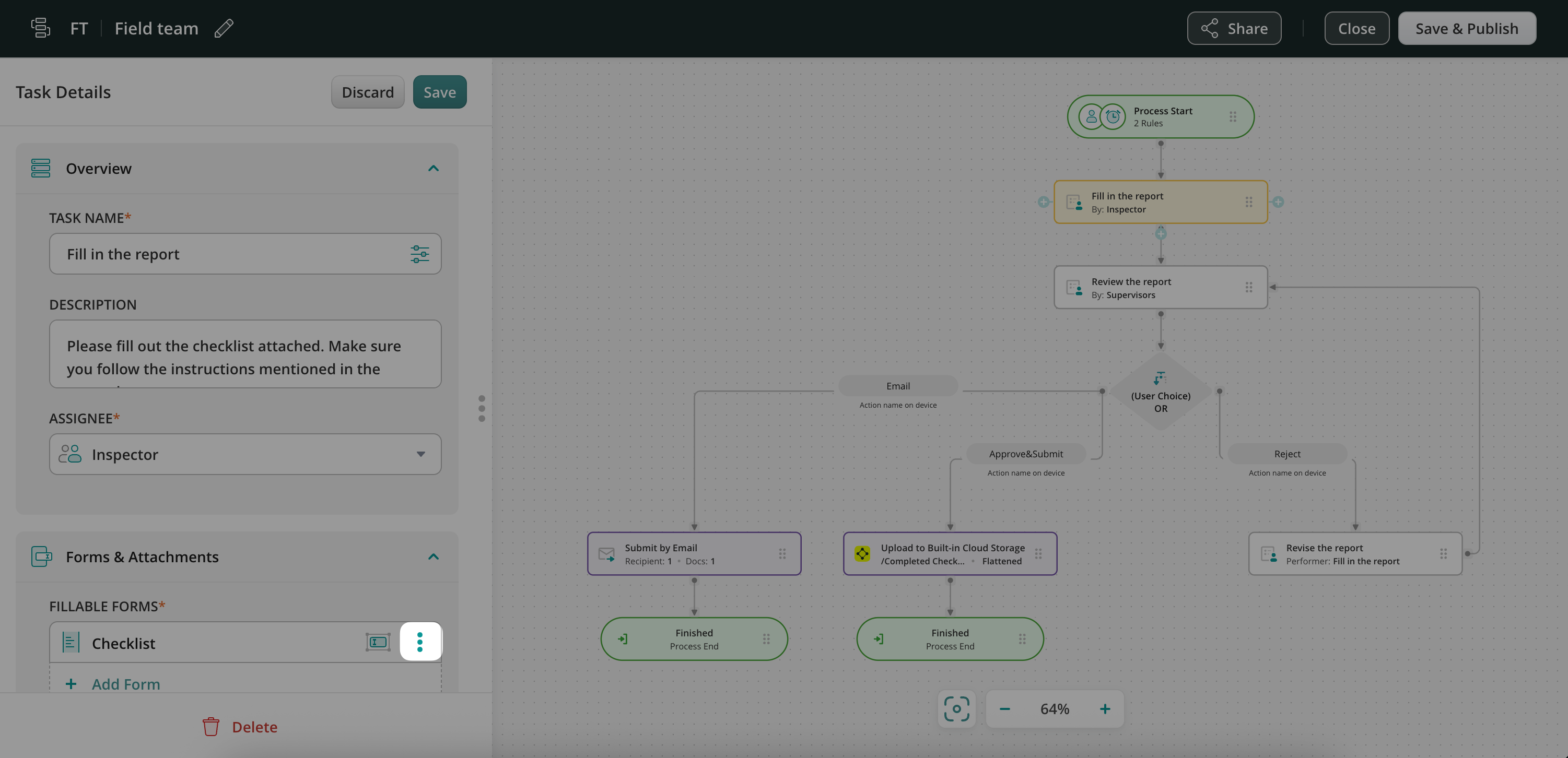 6. Once done, click Save to confirm the changes on the task level -> click Save & Publish to activate your workflow with a new form.