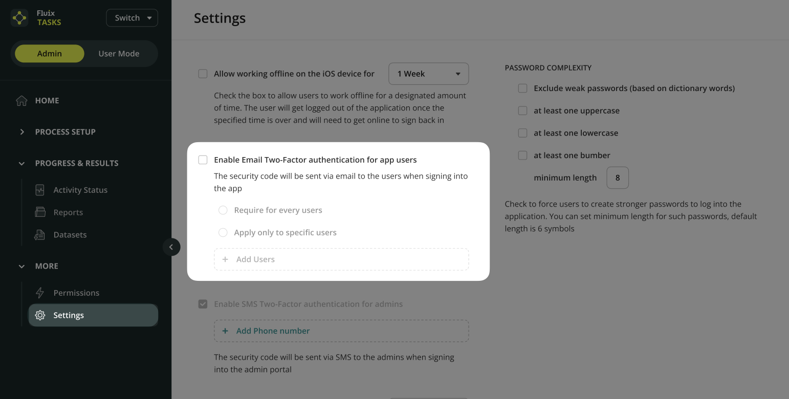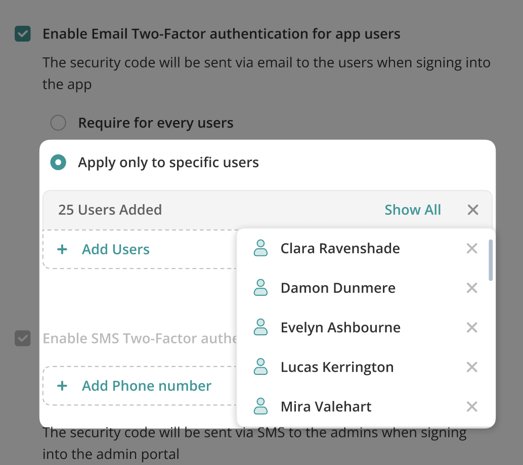 Email 2FA for app users is disabled by default. When enabled, it can be applied either to all users, which is the default behavior, or only to specific users. Admins have the ability to add users to the specific users list and remove them from that list at any time.