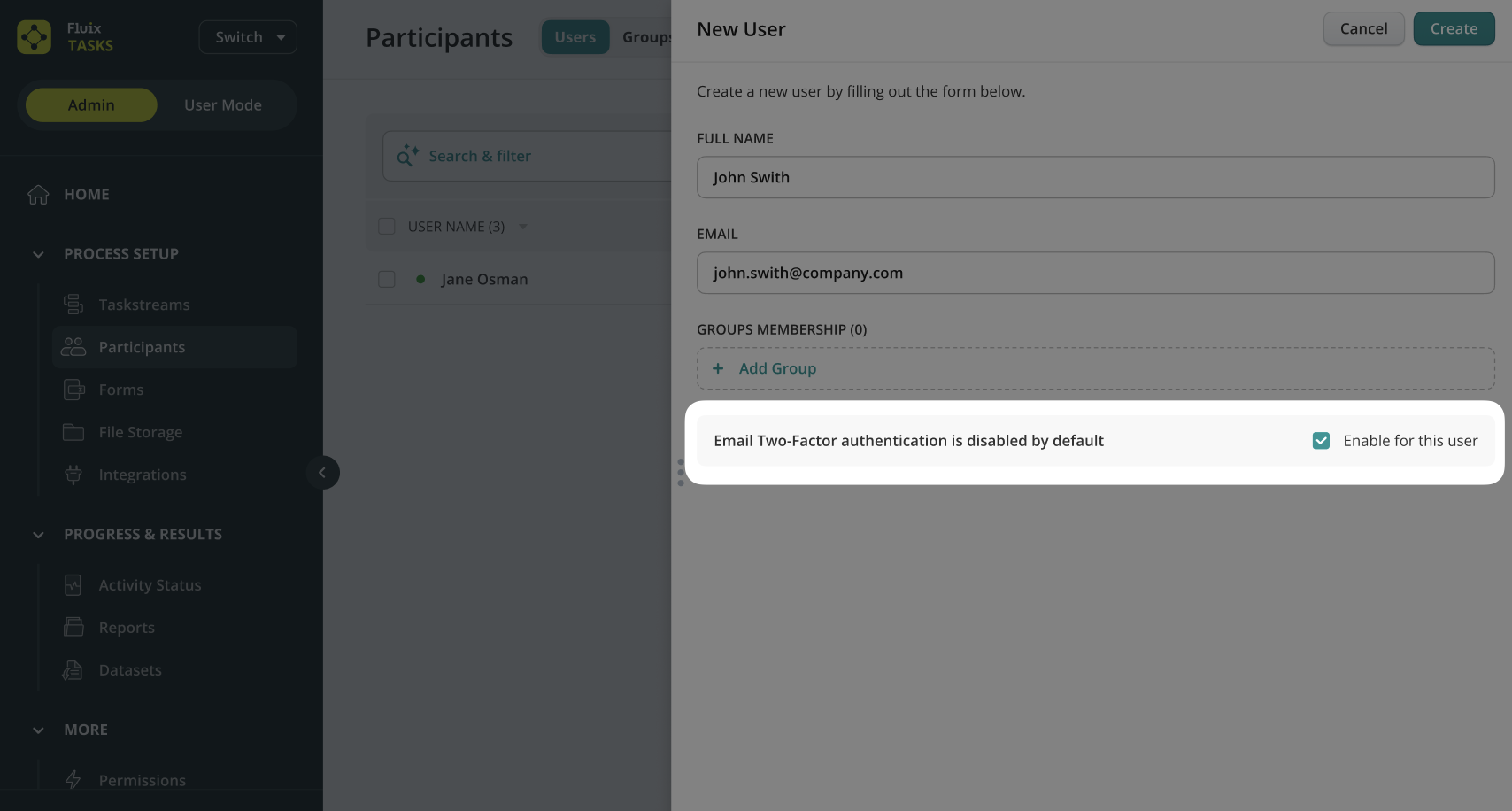 If Email 2FA for app users is disabled, admins can still manually enable 2FA for a new user during the account creation process. If Email 2FA is already enabled for all users, the admin will be informed during new user creation that 2FA is active automatically.