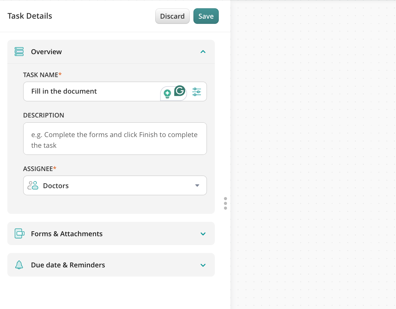 Navigate to the Fluix admin portal, Workflows section, to create a new workflow. Drag and drop a User task to the working area and configure it by adding fillable forms and assigning it to the team that will work on it on a regular basis. Make sure that you have added yourself to the group of users in order to test the setup later.